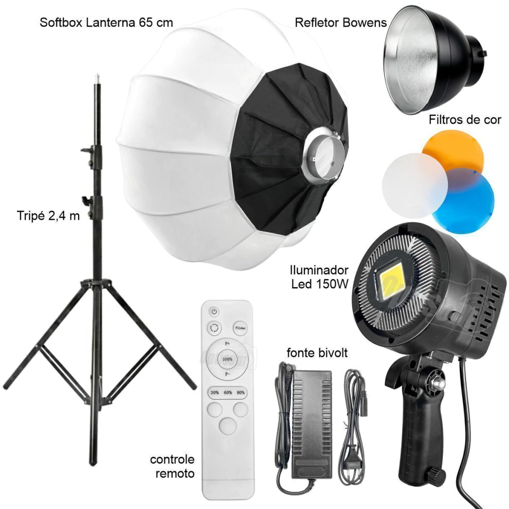 Kit completo Iluminador de LED luz contínua de 150W bivolt Branco Frio com SOFTBOX lanterna balão chinês de 65cm, Tripé de 2,4m, filtros para ajuste de temperatura e controle remoto, ideal para fotos e vídeos.