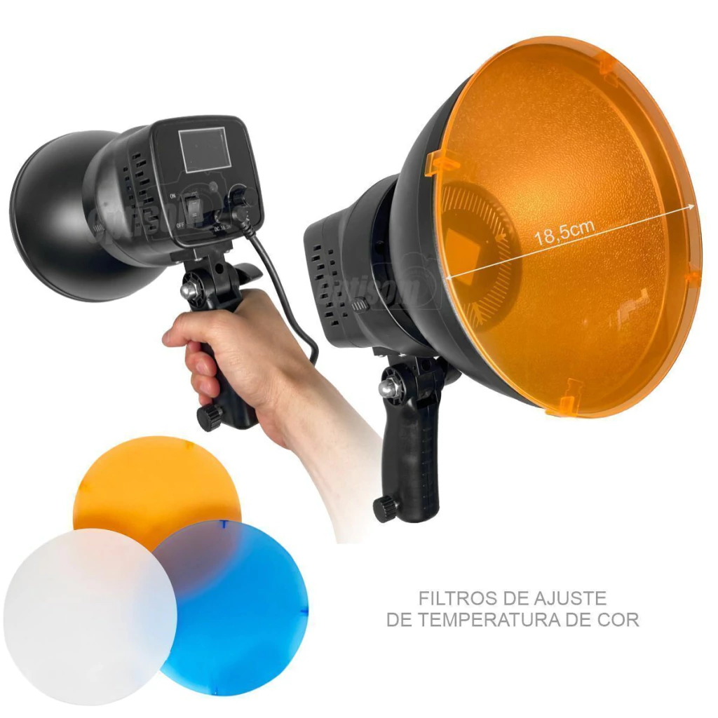 Luz branca (day light) com ajuste de intensidade e controle de temperatura através de filtros laranja e azul incluso, além de um difusor branco.