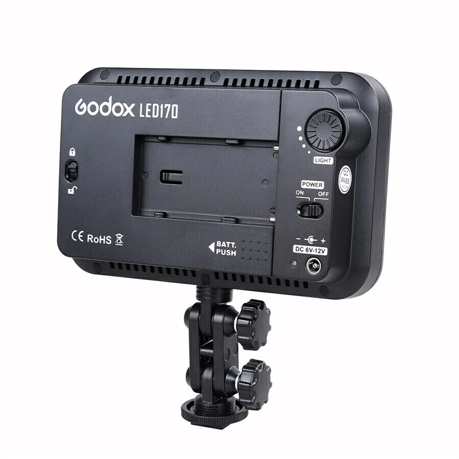 O iluminador de LED 170 Godox é compatível com câmeras D-SLR e filmadoras de sapata padrão.Possuí 170 leds distribuídos em um painel retangular no formato "Wide", que podem ser dimerizados e acompanha um filtro difusor branco, funciona com as baterias da série NP-F970 / F770 / F550 e toda linha NP-F da Sony e também funciona com 8 pilhas AA Alcalinas ou recarregáveis (pilhas não inclusas), o LED também trabalha com fonte de 6-12v.