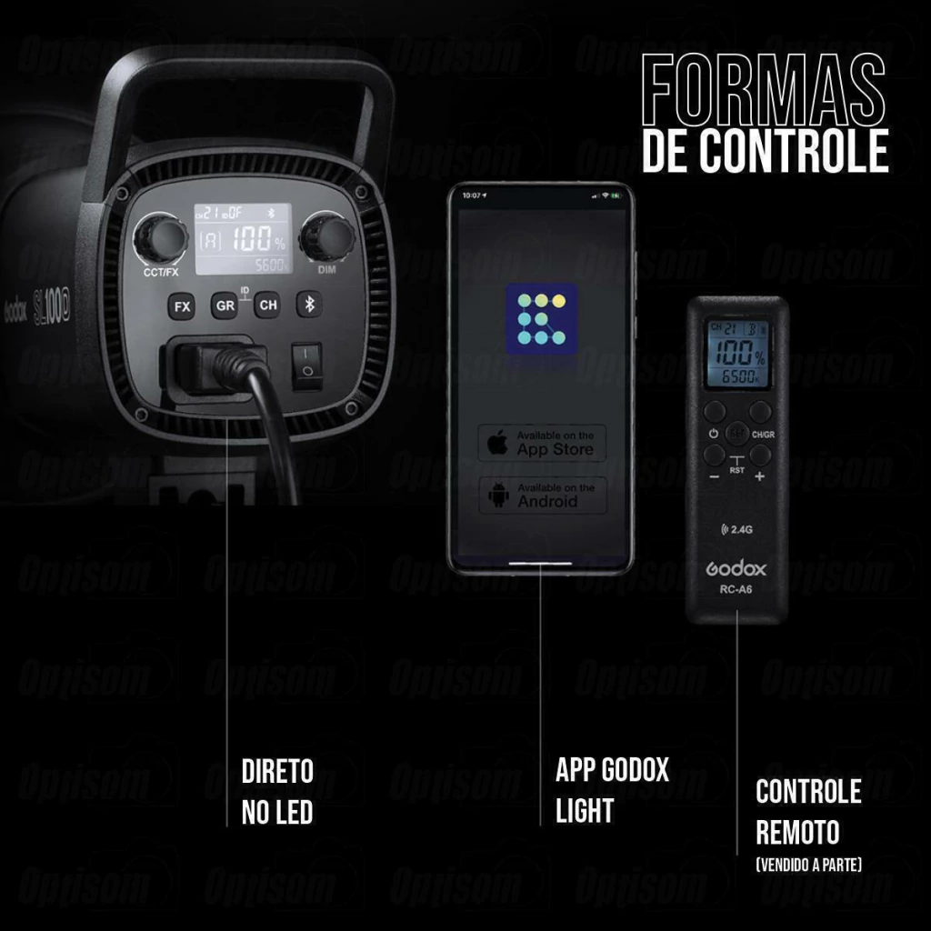 As funções do SL100D podem ser ajustadas no aparelho, com um smartphone usando o Godox App ou com um controle remoto sem fio vendido a parte.