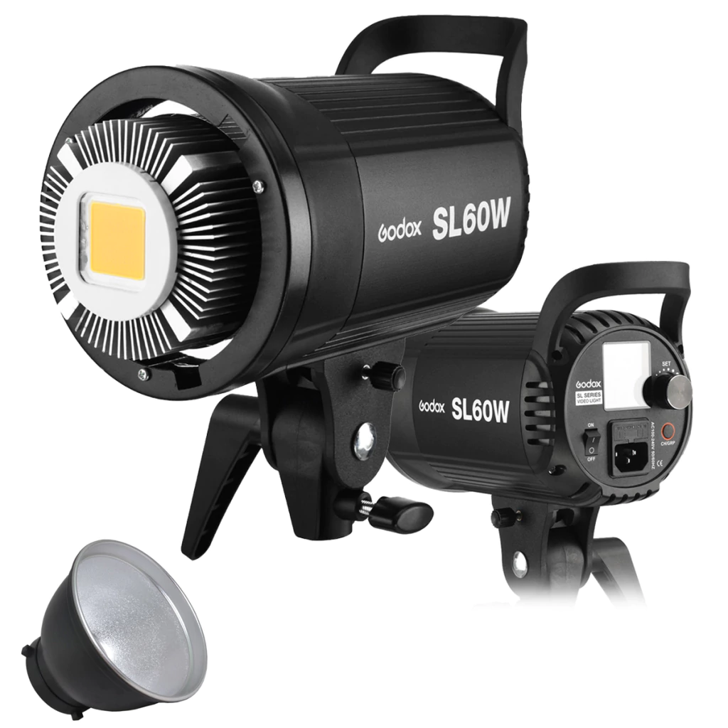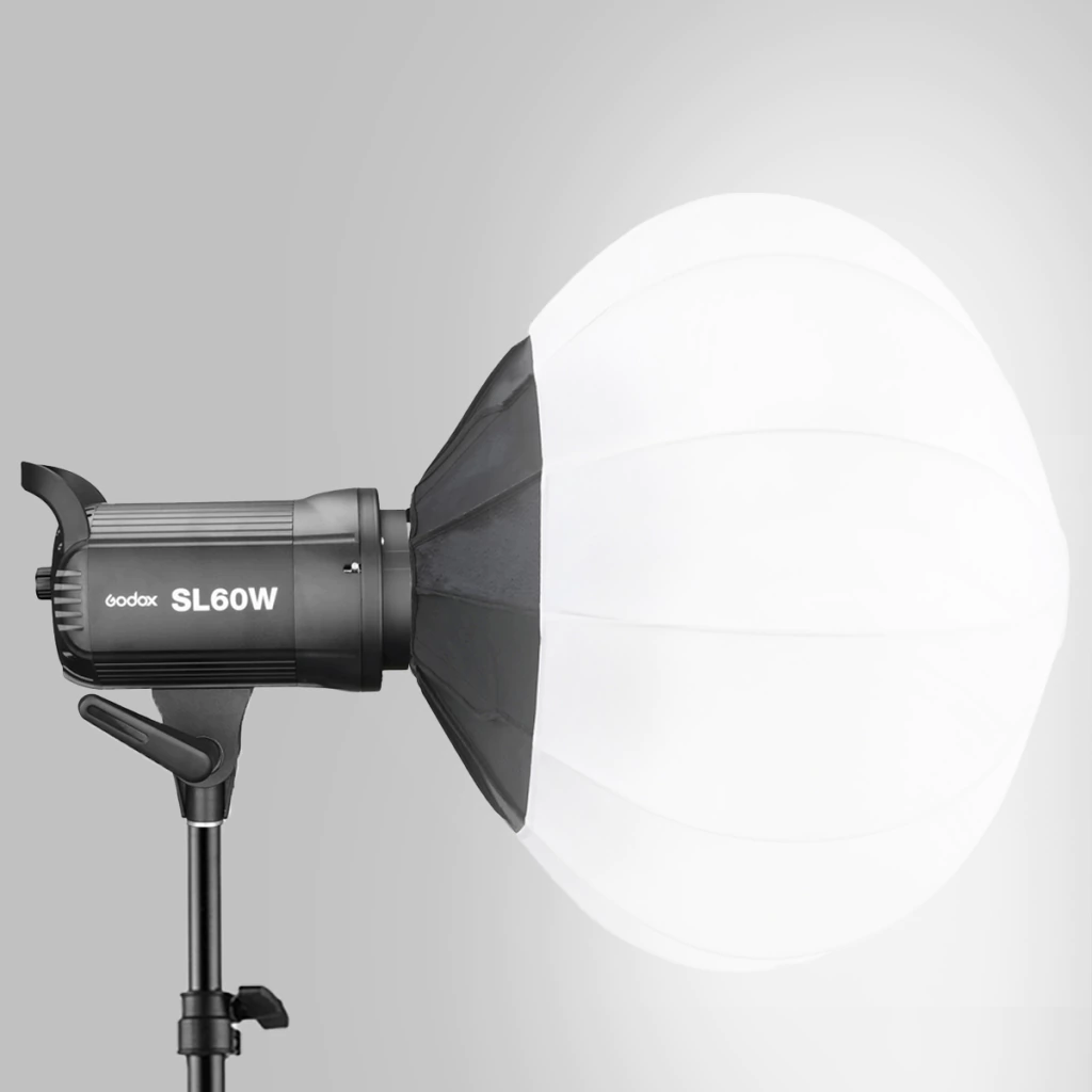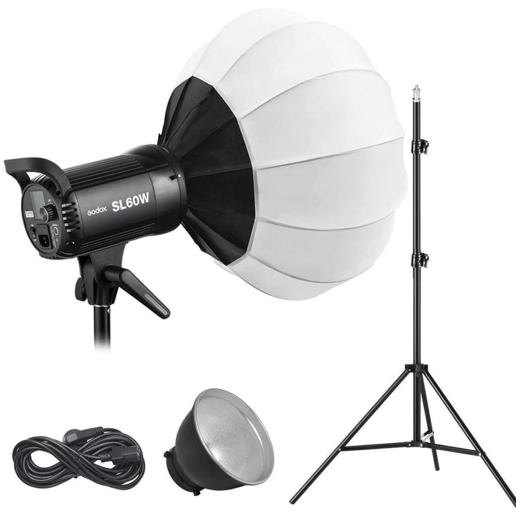 Este kit de iluminação para estúdio compõem um iluminador de Led Godox SL60W, um softbox tipo lanterna japonesa de 65cm de diâmetro e um tripé de iluminação de 3 metros.