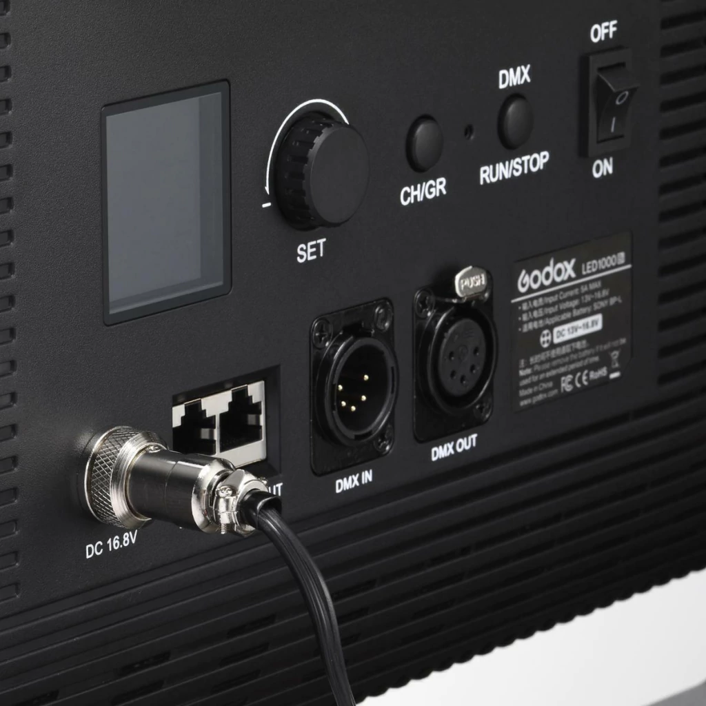 As configurações de escurecimento variam de 0% a potência máxima e podem ser ajustadas usando o painel LCD integrado da luz de vídeo. Para maior versatilidade, a luz de vídeo LED bicolor DMX LED1000Bi II também possui conectividade para controladores DMX.