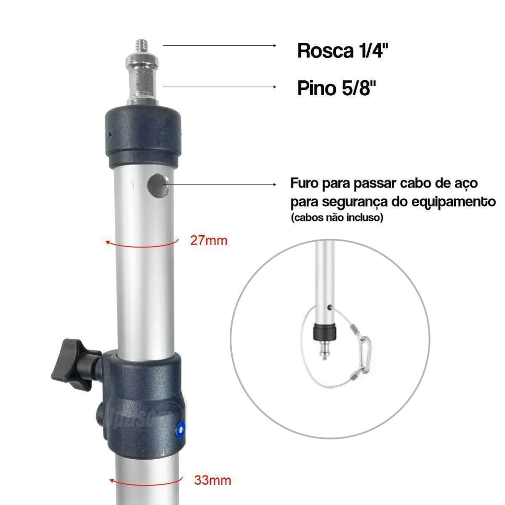 luz com encaixe Bowens e acessórios com encaixe tipo sombrinha.