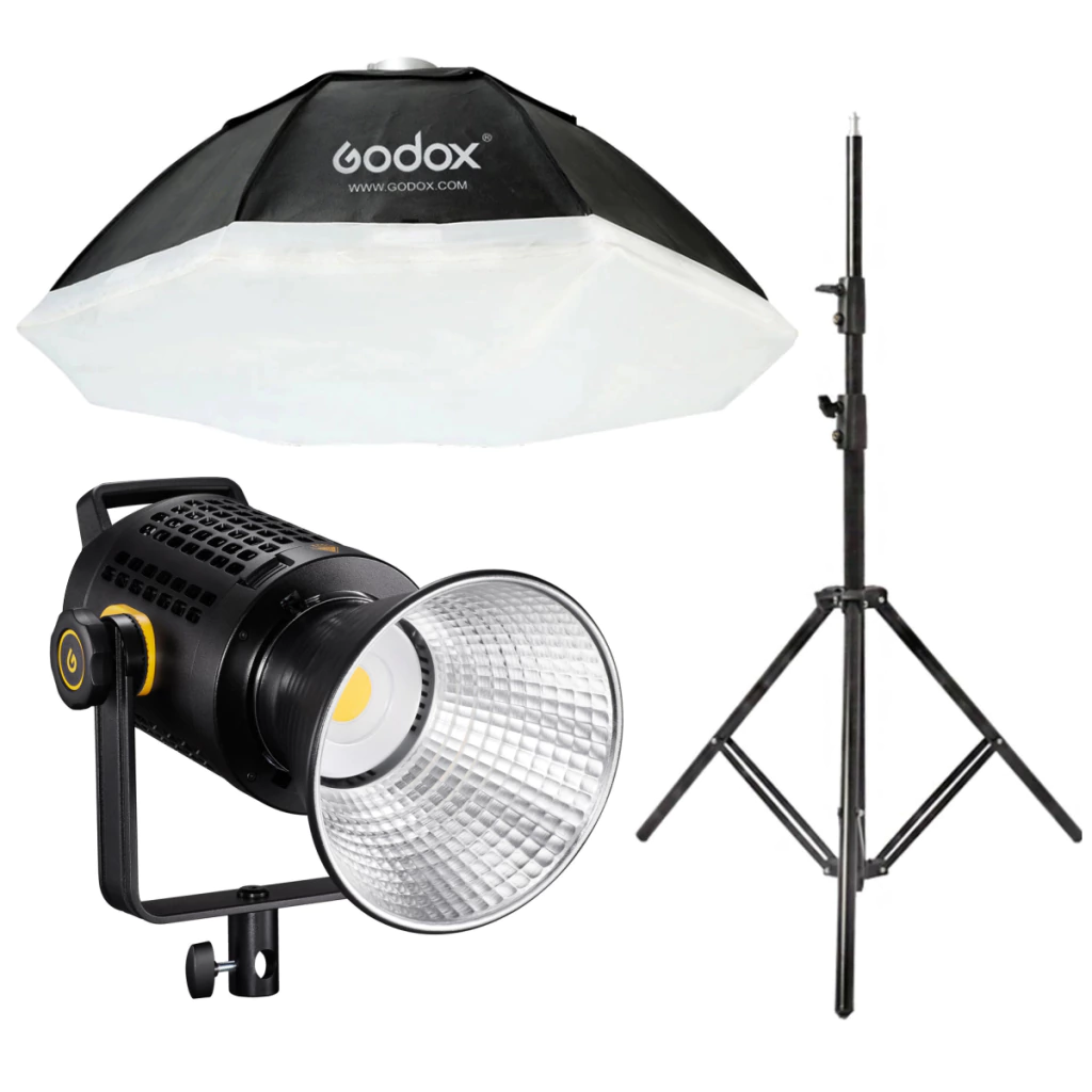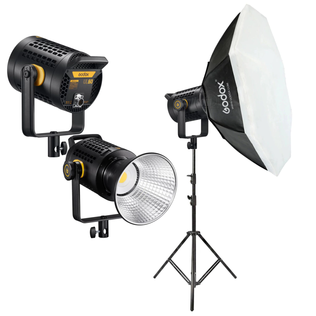 Kit octabox 120 cm Tocha Luz de vídeo LED UL60 silenciosa da Godox é uma lâmpada LED CONTÍNUA e de EFEITOS de luz de 60W balanceada para a luz do dia (5600K) e chega a 2,4 metros de altura.