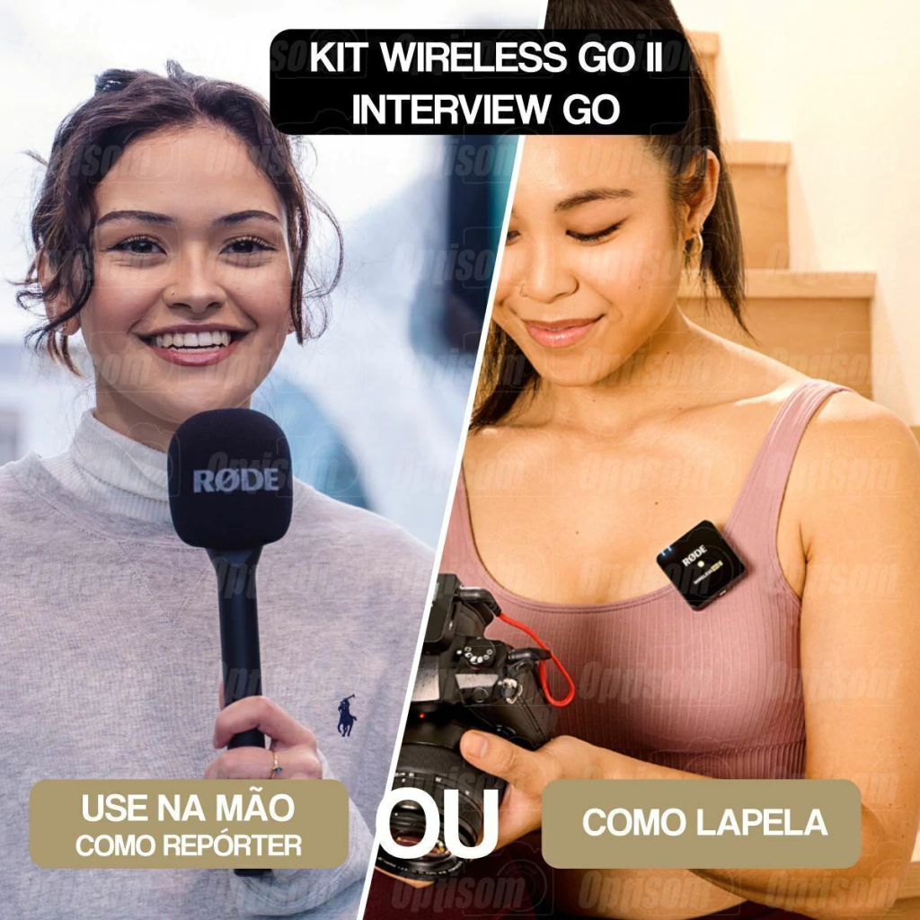 MICROFONE RODE SEM FIO LAPELA WIRELESS GO II Single + Suporte de mão Rode Interview Go