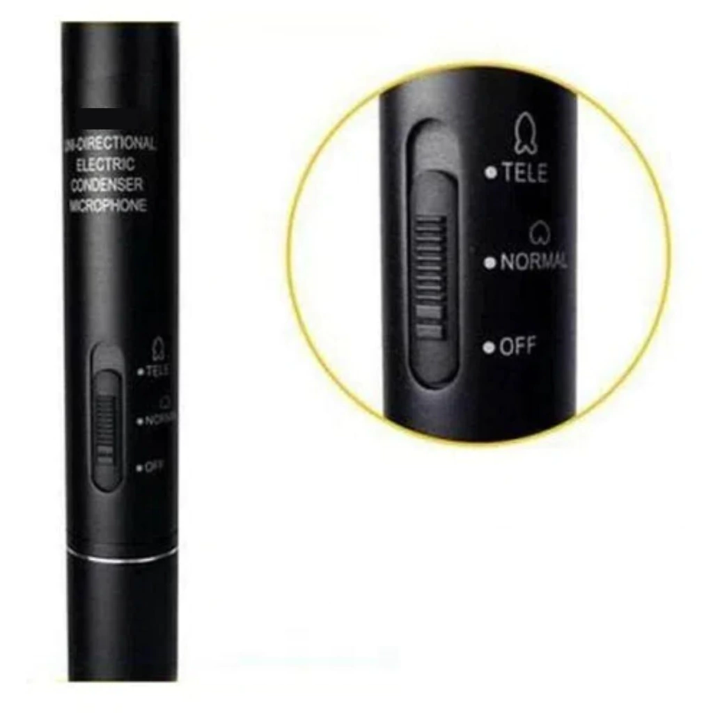 Com captação aberta (ambiente) e direcionada (evita sons laterais), este Microfone Direcional possui chave seletora com 3 estágios: Off (desligado), Normal (aberto) e Tele (fechado).