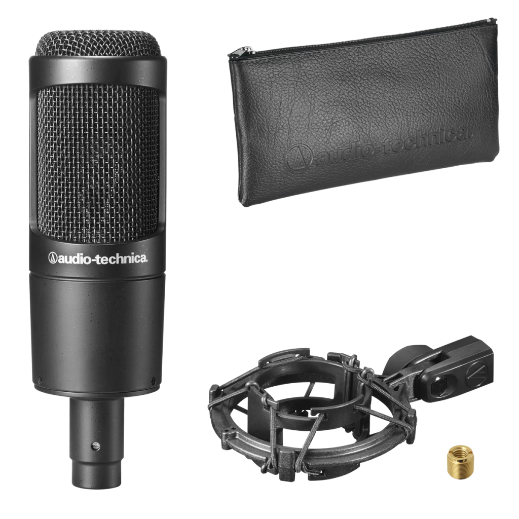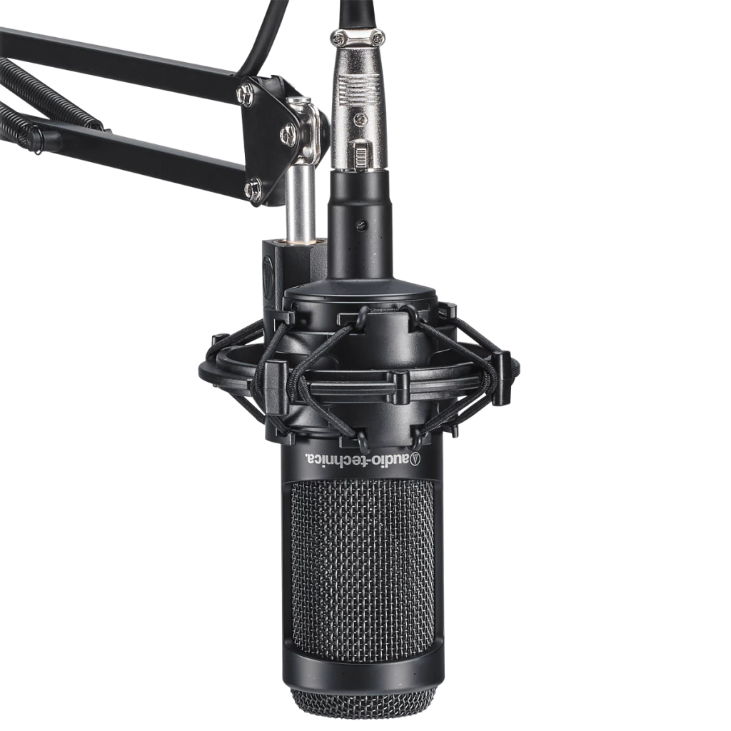 O kit inclui um microfone condensador cardioide AT2035, um par de fones de ouvido profissionais para monitoração ATH-M20x e um braço articulado para estúdio com cabo XLR integralmente instalado.