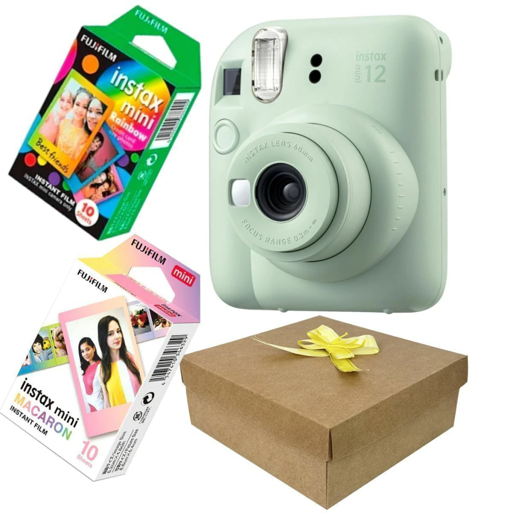 KIT PRESENTEÁVEL COM A NOVA CÂMERA FUJIFILM REVELA FOTO NA HORA INSTAX MINI 12 + FILME RAINBOW 10 FOTOS + FILME MACARON 10 FOTOS