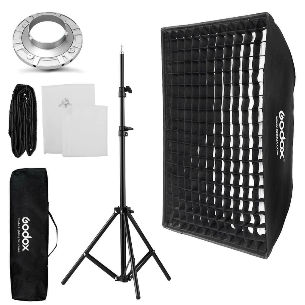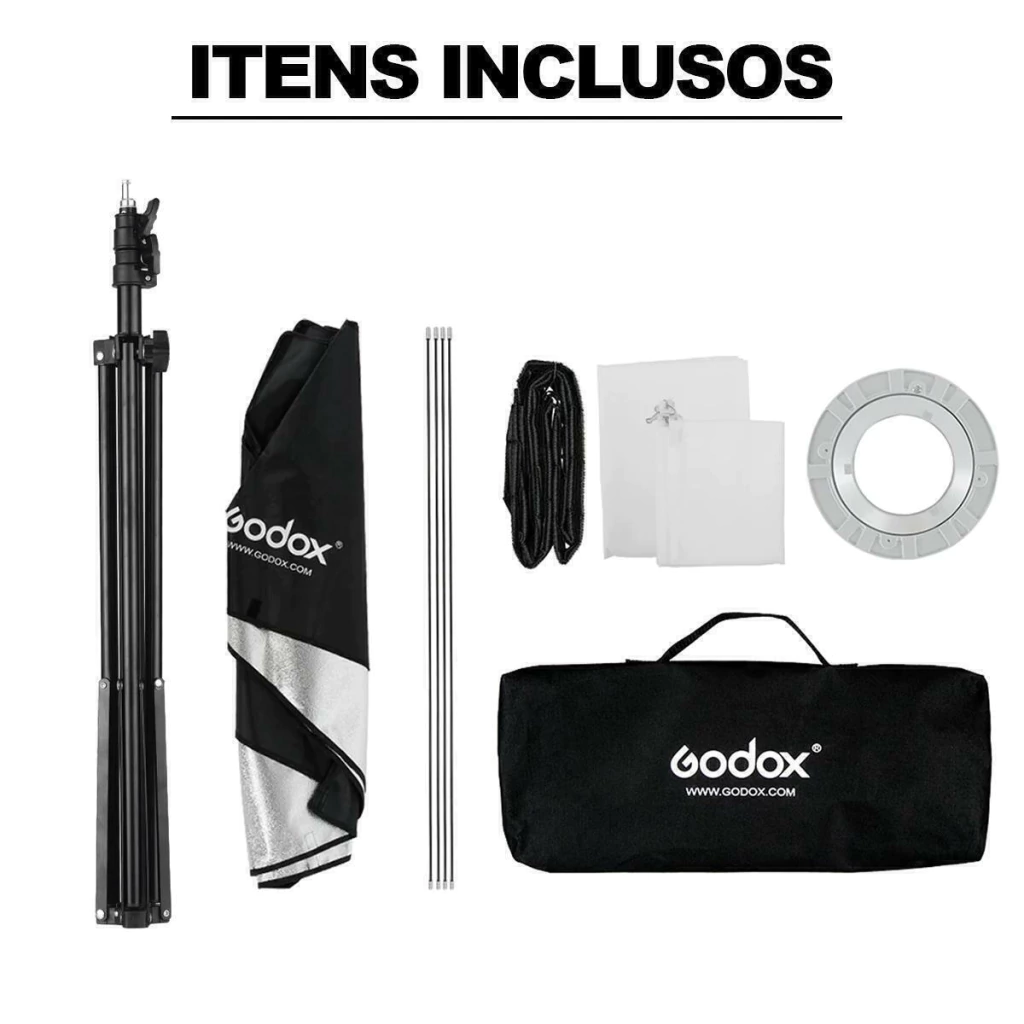 Kit softbox 60x60cm Godox com Grid e telas difusoras + tripé de iluminação de 2,4 metros, desenvolvido para estúdios fotográficos para uso com flashes/tochas.