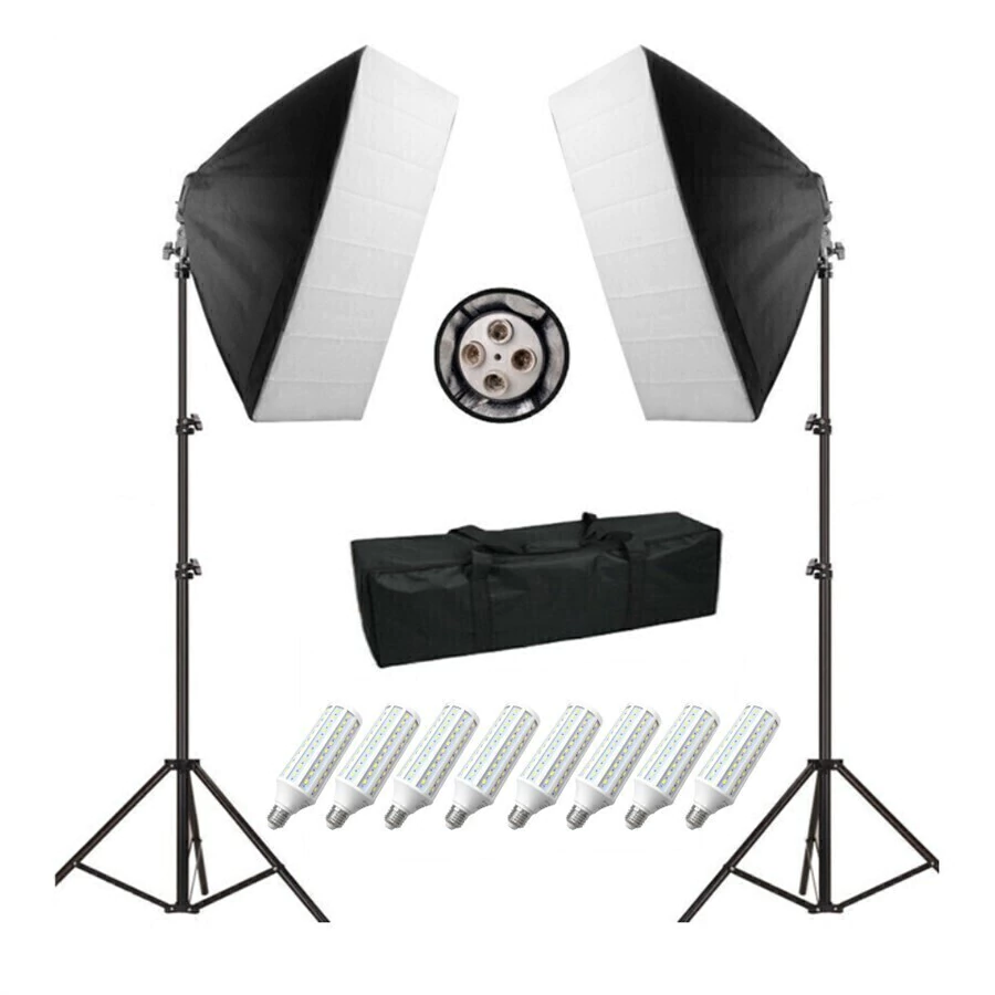 Kit Greika PKSB01B, iluminação fria contínua para estúdio com lâmpadas LED BIVOLT, proporciona uma iluminação adequada, difusa e perfeita, sua potência vai de 60 W até 480 watts pois conta com 8 lâmpadas (4 lâmpadas em cada softbox) com 60 watts cada podendo ser utilizado com metade de sua potência através da chave liga-desliga localizada na parte de trás dos soquetes.