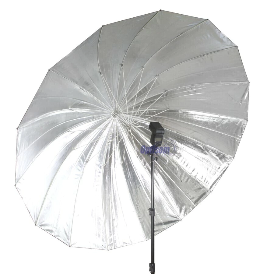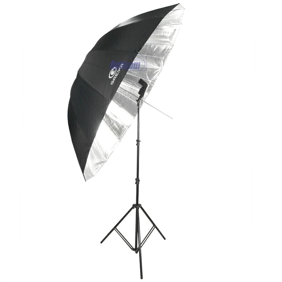 Sombrinha Refletora Preto/Prata BS1675 Greika 180 cm é feita em nylon e estrutura em metal cromado é ideal para seu estúdio fotográfico.