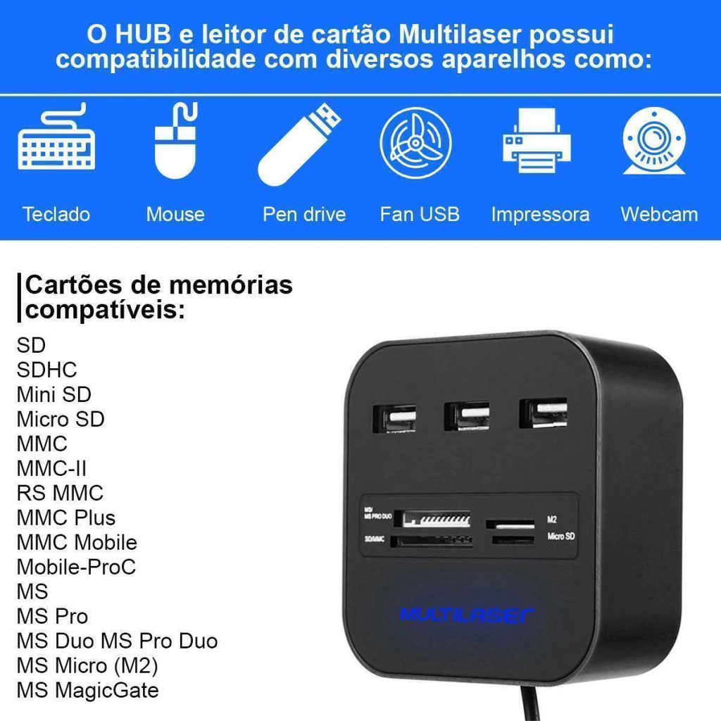 01 Leitor de cartão e HUB USB 2.0 Multilaser 2 em 1