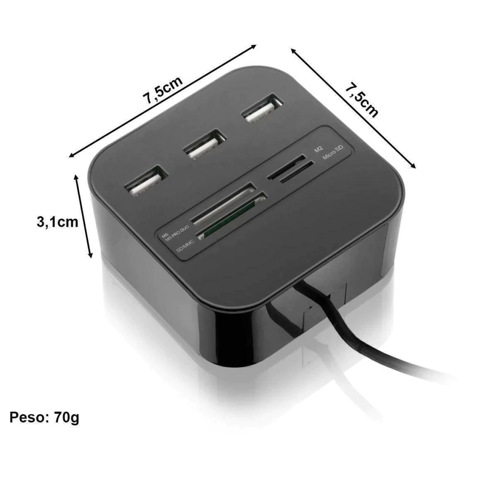 Leitor de cartão USB 2.0 e Hub com 3 entradas USB, é um acessório 2 em 1. Além de entradas para cartões Micro SD, SD, MS e M2; ele possui 3 entradas USB para poder conectar outros dispositivos a partir dele, como teclado, mouse, etc.