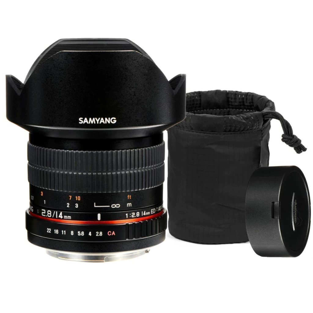 Objetiva Ultra Angular para Canon EF Fullframe 14mm f / 2.8 ED AS IF UMC da Samyang possui uma abertura máxima de f/2.8 brilhante e é adequada para assuntos que variam de paisagem a arquitetura, fotos e vídeos de interiores e mais.