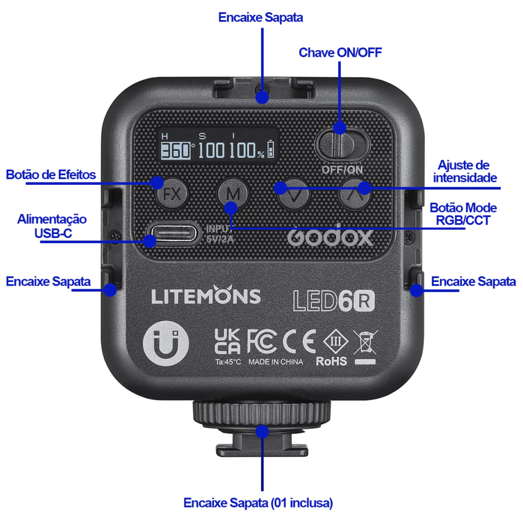 Sua parte traseira possui um imã magnético que pode ser fixado com segurança em qualquer superfície metálica. O painel traseiro conta com botões que fornecem diversos modos de iluminação e configuração, possui 13 efeitos de luz FX, modo RGB de 36.000 cores e CCT com cor variável (3200K - 6500K), controle de intensidade e brilho de 0 a 100%.