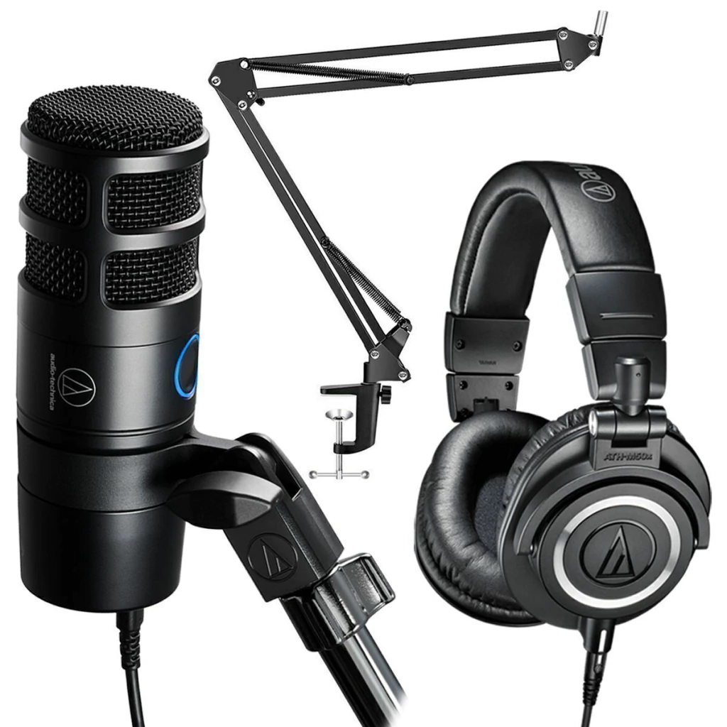 O kit Audio-Technica AT2040USB com braço articulável e fone de ouvido ATH-M50x proporciona uma experiência completa de áudio profissional.