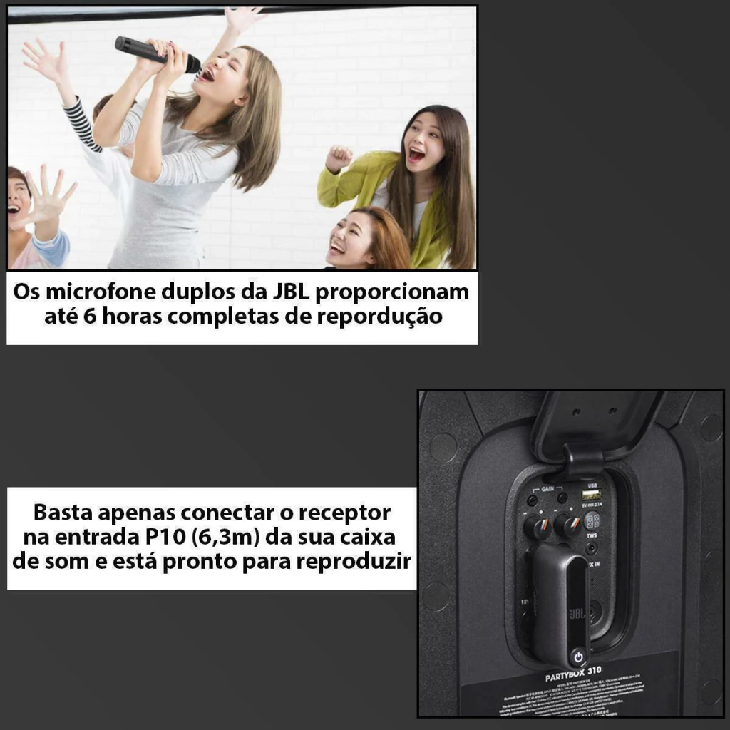 Chegou a sua hora de ser o centro das atenções. Os microfones sem fio da JBL oferecem o original JBL Pro Sound com clareza e detalhe vocal. Aproveite a melhor qualidade de som e alcance as notas altas sem distorção ou atraso.
