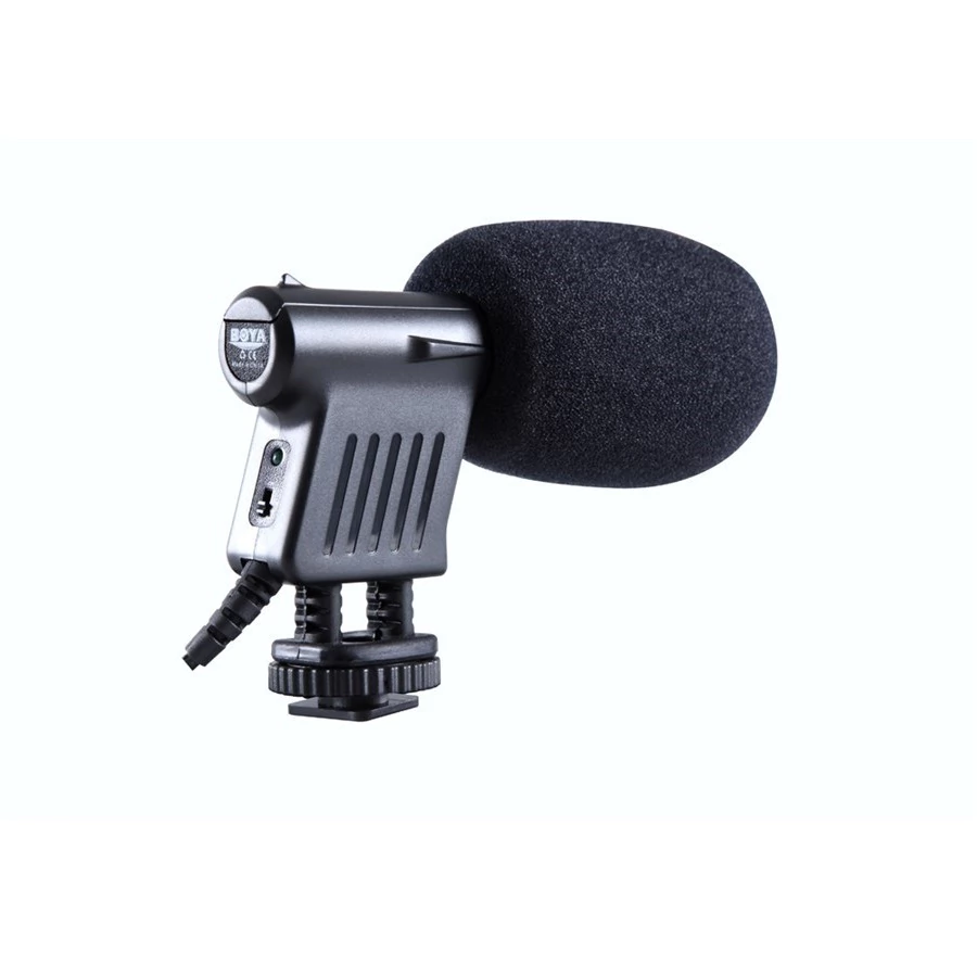 O mini microfone BOYA BY-VM01 foi projetado para uso com câmeras DSLR digitais e câmera de vídeo com um conector P2 estéreo de 3,5 mm (diâmetro), e se encaixa em sapatas. Ideal para usar com câmeras compactas de viagens para gravar diário de viagens e vlogs para o Youtube. Equipado com uma parada de cabo que segura o cabo no lugar para evitar que o ruído seja gravado acidentalmente, além de uma sapata com sistema de borracha para evitar ruídos. Microfone Condensador Unidirecional. Circuitos de baixo ruído