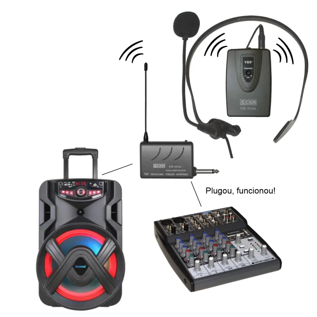 Microfone headset sem fio permite que você conecte ele em qualquer entrada de microfone P10, tanto caixas de som quando mesas e etc.