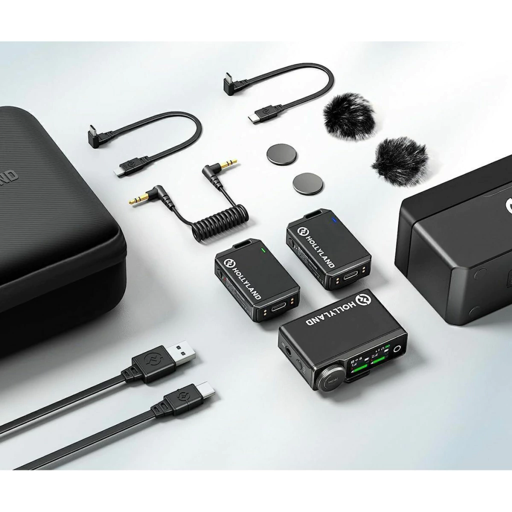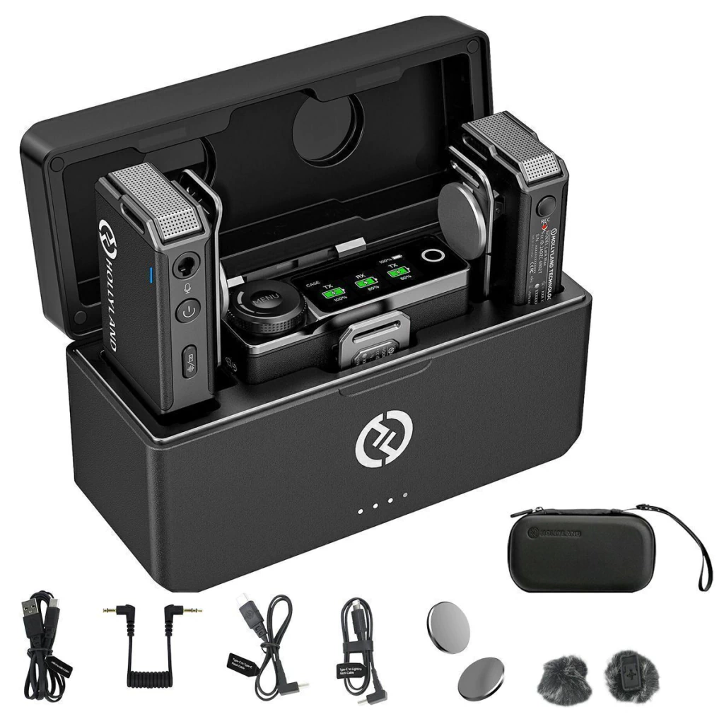 O sistema de microfone sem fio LARK MAX Duo preto da Hollyland pode se adaptar a qualquer aplicação de jornalismo ou criação de conteúdo, graças à sua ampla compatibilidade com câmeras e smartphones.