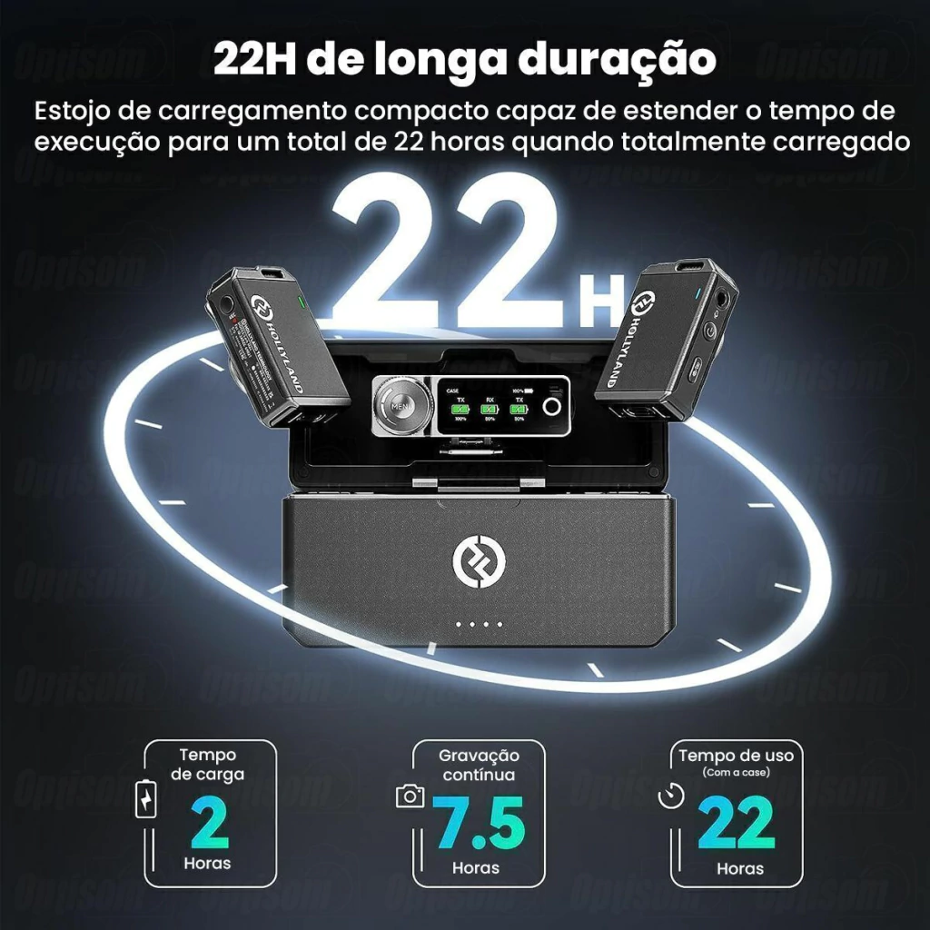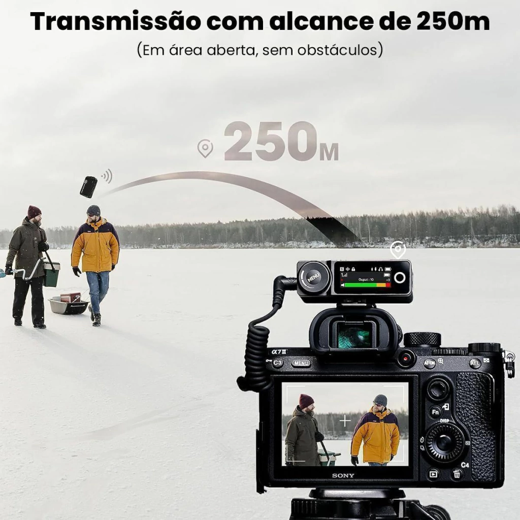 O sistema apresenta uma distância máxima de transmissão de linha de visão de 250 metros. Mantenha tudo funcionando com o estojo de carregamento incluído para prolongar a vida útil da bateria do sistema.