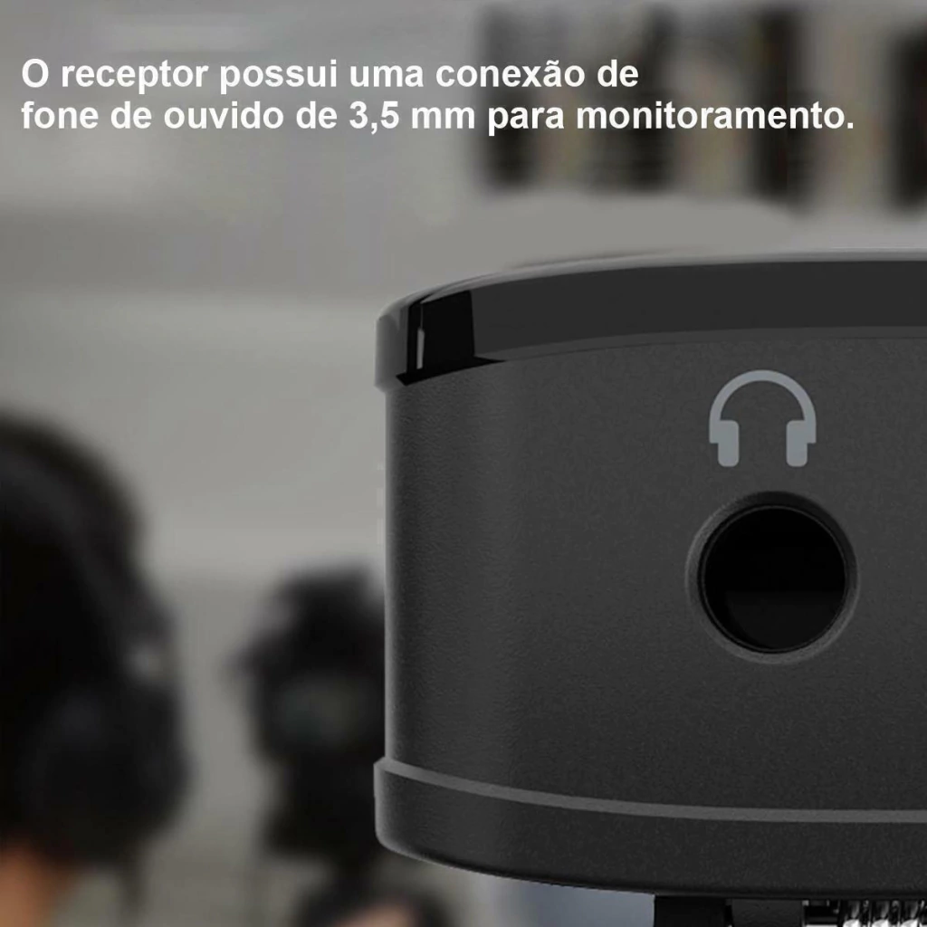 O receptor compacto de dois canais oferece um alcance operacional máximo de linha de visão de 100 metros e inclui um clipe de fixação e um conector de saída de 3,5 mm.