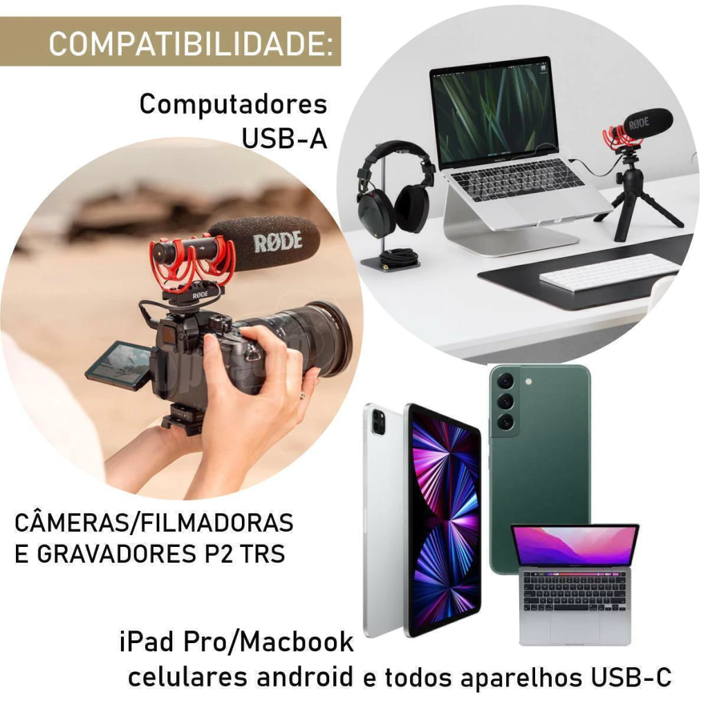 P2/P2, USB-A e CABO USB-C RODE SC16 para Android, iPad Pro, MacBook e todos