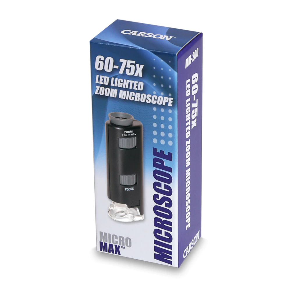 Microscópio portátil Carson MM-200 MicroMax Plus. Este dispositivo compacto cabe prontamente em seu bolso e tem ampliação de 60x a 75x.