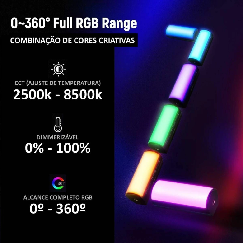 Faixa RGB completa de 0 a 360 graus, cores ricas e mais