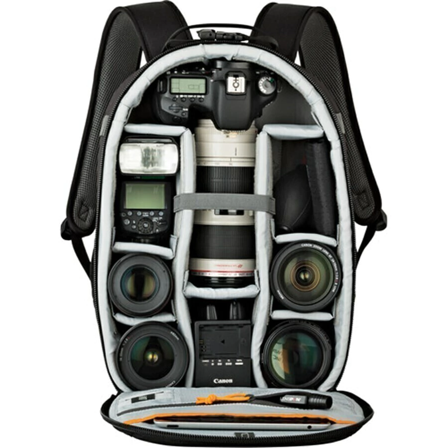 Acomoda mais de 4 Lentes médias e uma 70-200mm. Mochila preta Photo Classic Series BP 300 AW da Lowepro possui um design direto, simples, sem muitos compartimentos e bolsos. Na tampa há uma manga acolchoada, para um tablet de até 10 ", dois compartimentos específicos para cartões de memória e um saco com zíper para cabos e outros acessórios. Zíperes com duplo bloqueio oferecem um mínimo de segurança podendo ser travado com um cadeado (não incluso). Na parte da mochila tem um bolso com zíper adequado para documentos, revistas ou outros itens. Os bolsos laterais da malha para garrafa de água também são úteis para um par de luvas ou até mesmo um boné. Os usuários pode guardar um, tripé compacto na frente da mochila contando com ajuda de elásticos e um fecho para o travamento do acessório. Para reduzir a fadiga e proporcionar maior conforto, a Série Photo Classic BP 300 AW possui alças acolchoadas e ajustáveis. E para a estabilidade e ainda mais conforto, há um cinto de cintura acolchoado e ajustável que fecha com uma fivela de liberação rápida. O pacote é feito de poliéster 600D e 1680D para resistência e durabilidade. Uma capa integrada para todos os climas oferece uma excelente proteção. Dimensões internas: 21x27x38x13cm (largura embaixo, largura no meio, altura e profundidade) Itens Inclusos: 01 Mochila Lowepro Photo Classic BP 300 AW LP36975. Garantia: 12 meses Marca: Lowepro Peso aproximado: 1,35 kg