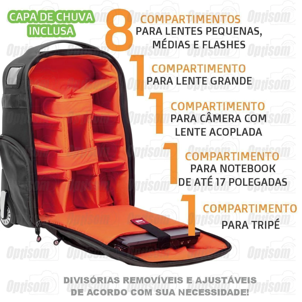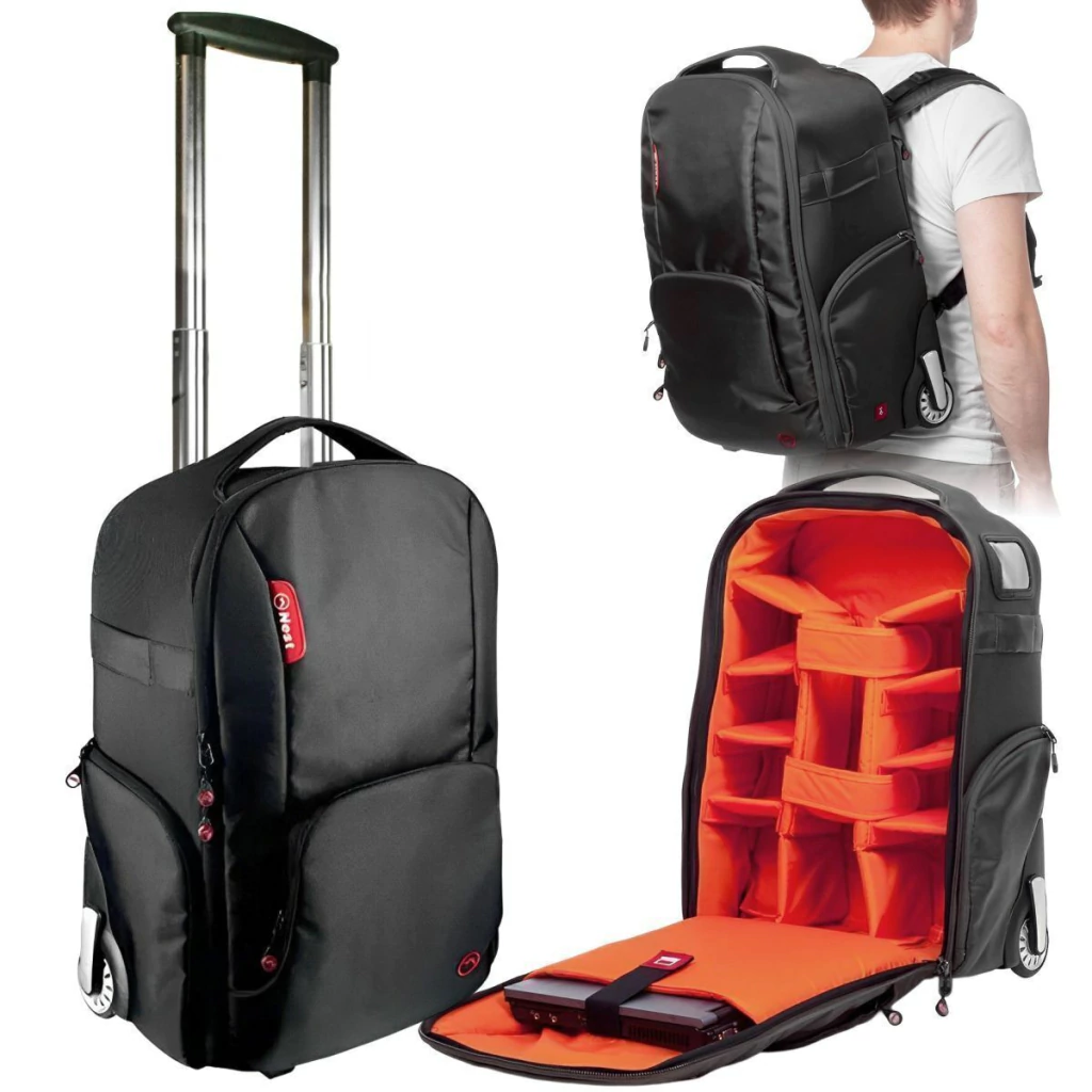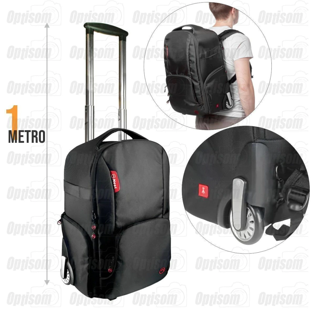 Mochila com rodinhas para câmera fotográfica, lentes, led, flash, tripé e notebook 17" Nest ATHENA 100.