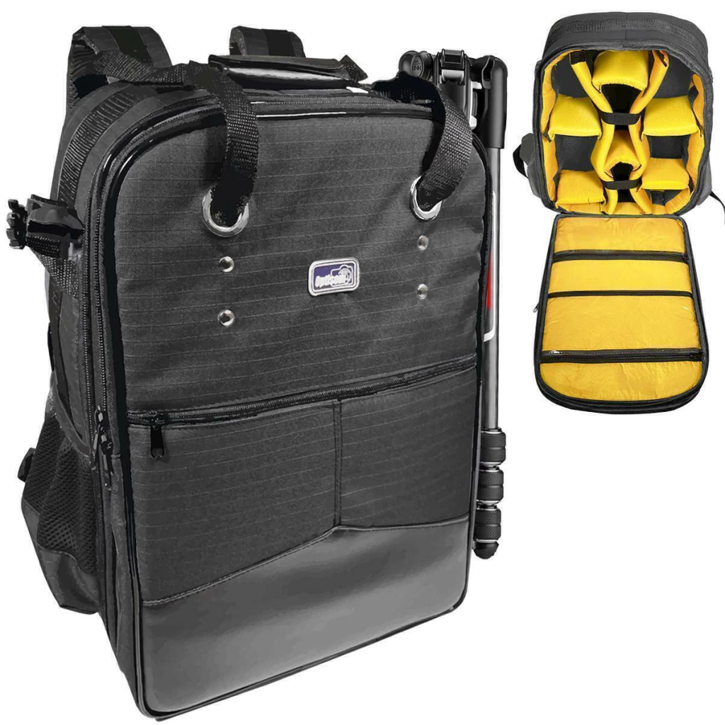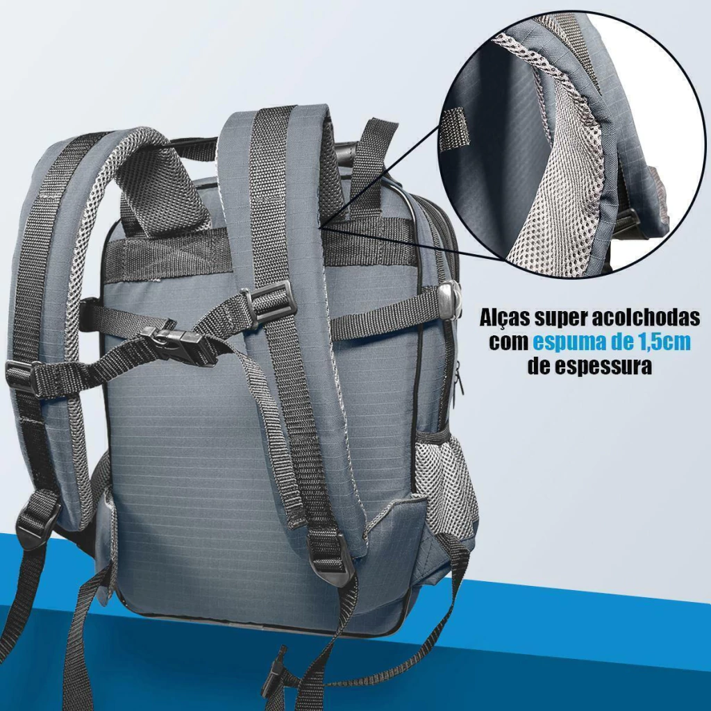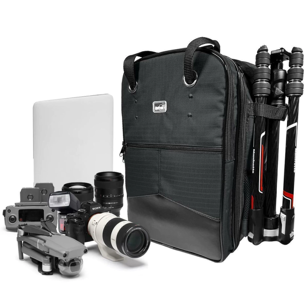 Tem um design discreto que não aparenta ser mochila de fotografia. Apresenta um compartimento com abertura zíper na parte frontal para armazenar acessórios como baterias, carregadores.