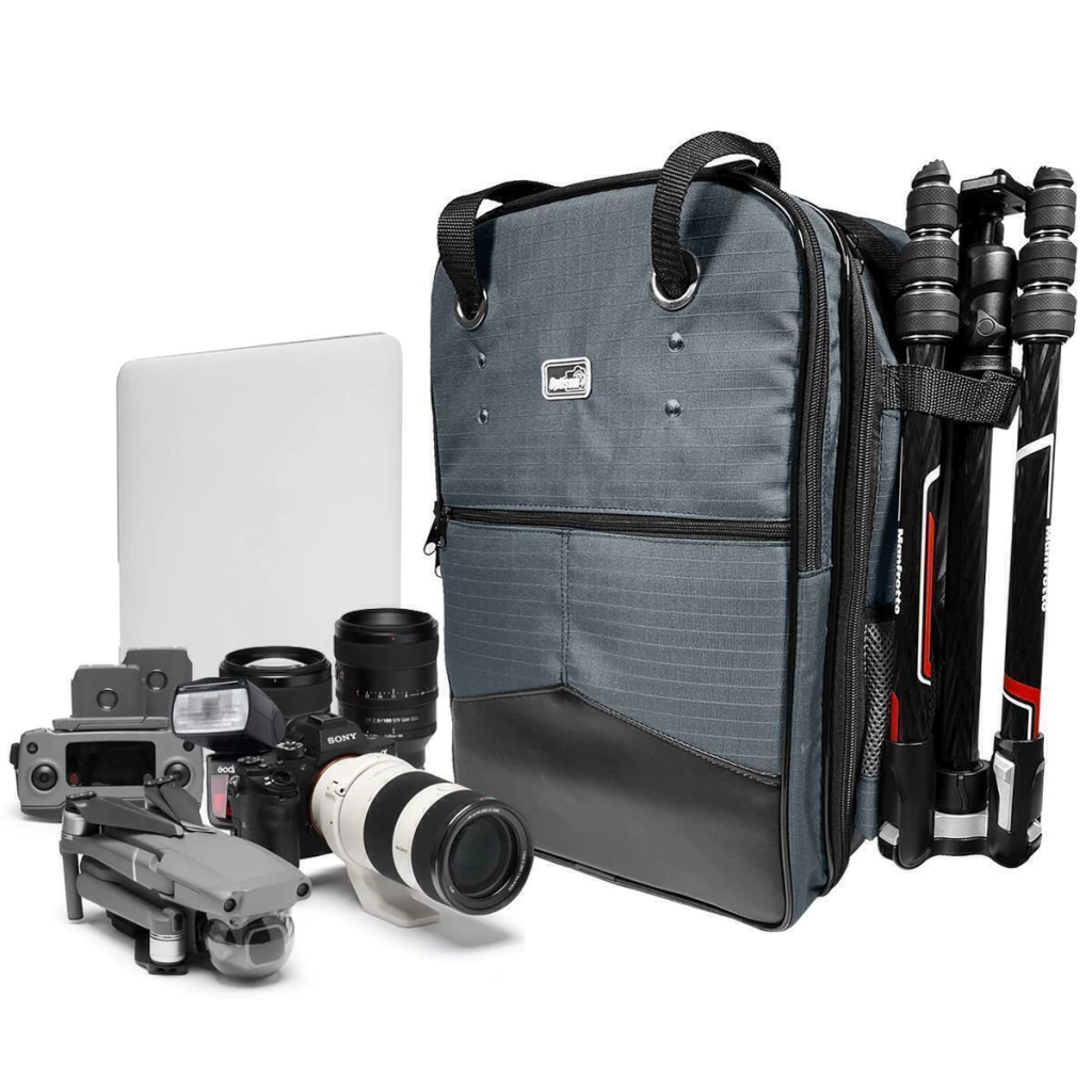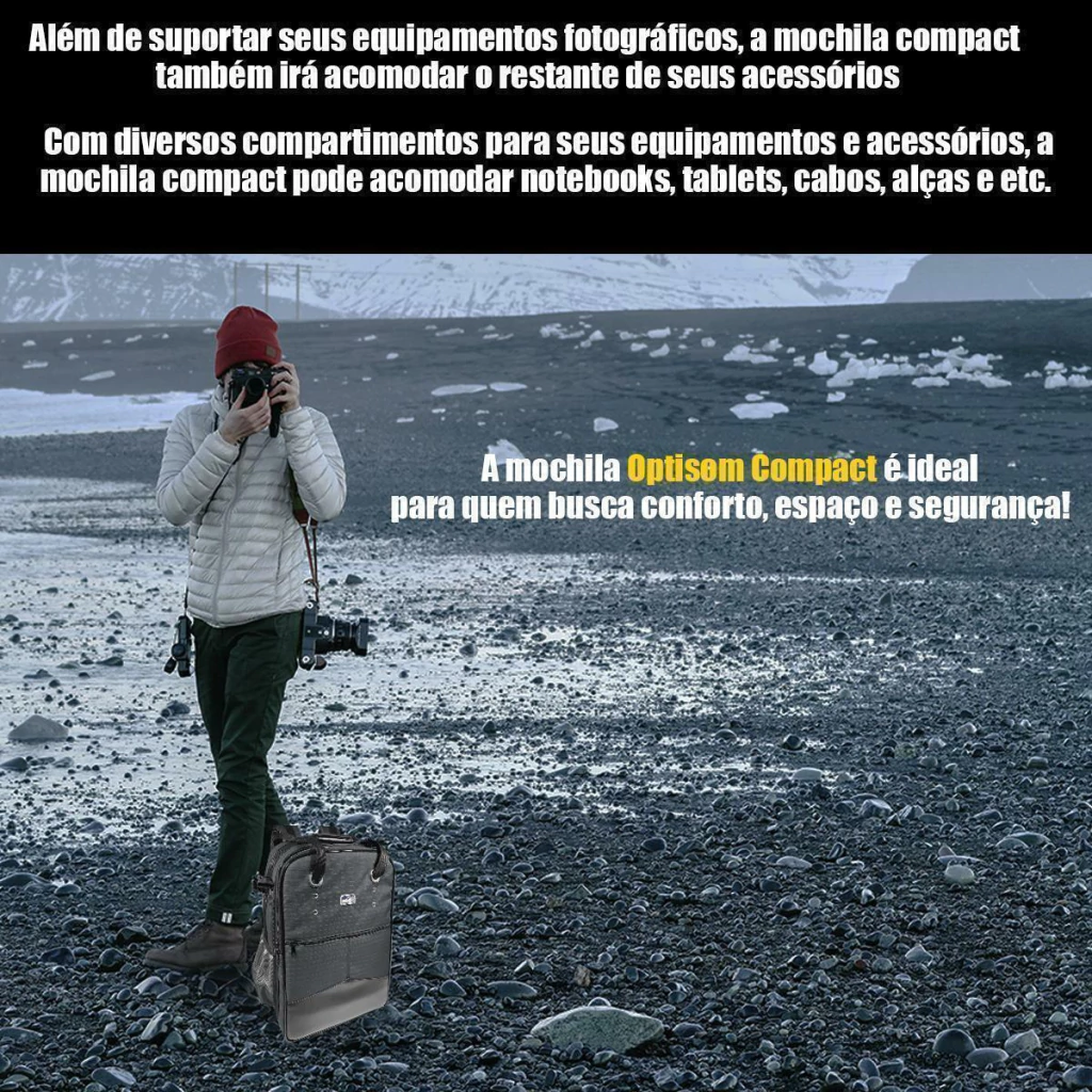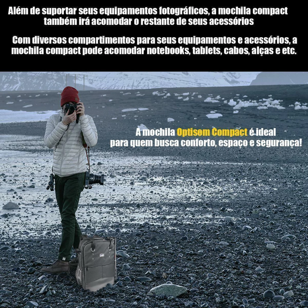 Mochila Compact Grey Optisom, acomoda os seus equipamentos de foto ou vídeo e seu notebook com segurança e praticidade!