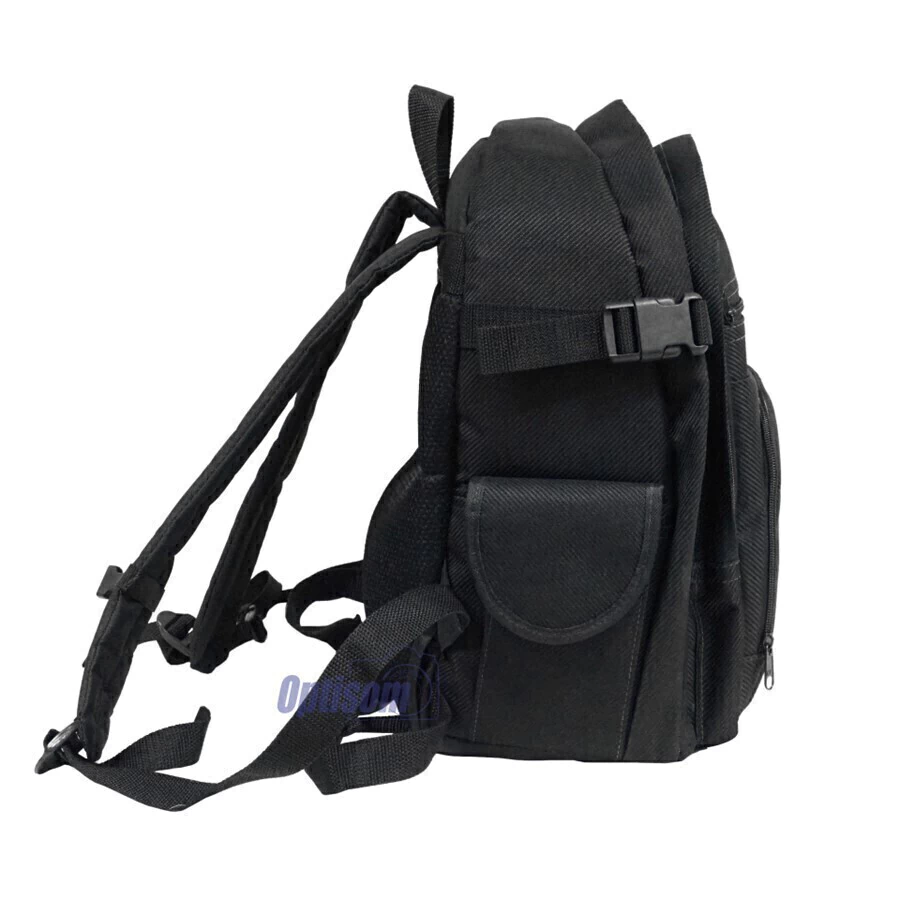 Acomoda equipamentos e uma ampla gama de acessórios Acomoda tablet (compartimento especial) Três compartimentos na parte frontal Dois bolsos laterais para acessórios de acesso rápido Alça Dupla para transporte e alça simples superior menor. Cor do tecido externo preto Capa de chuva