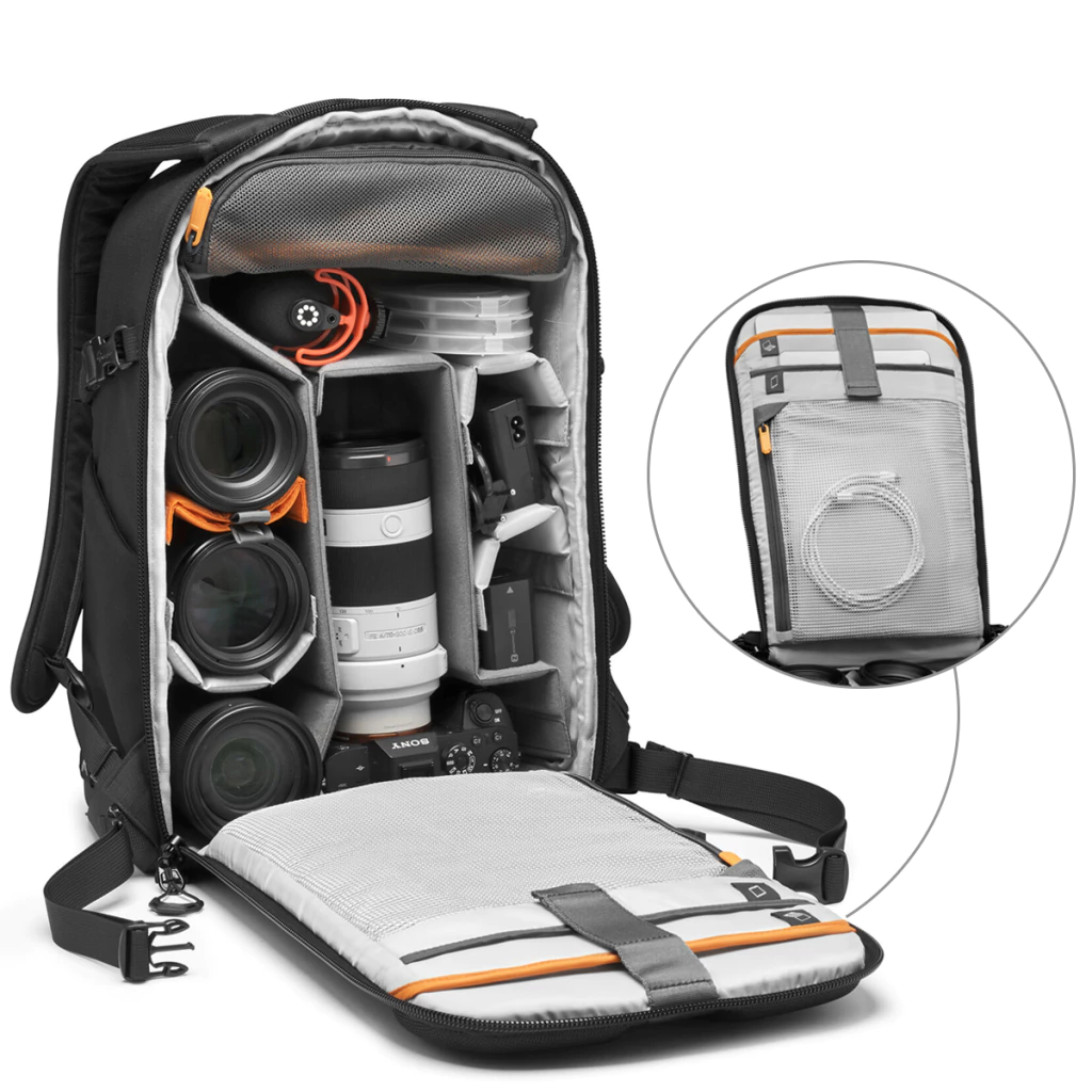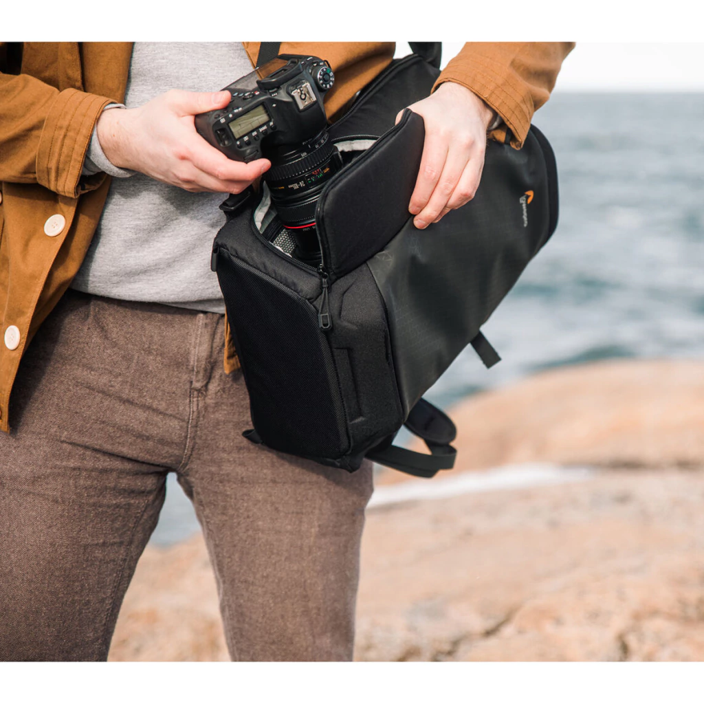O acesso traseiro atualizado oferece entrada fácil e rápida no compartimento da câmera, enquanto mantém o equipamento seguro e protegido em terrenos acidentados - basta retirá-lo, colocá-lo no chão e abrir o zíper do painel traseiro para acesso total ao equipamento. O novo acesso lateral fornece um segundo ponto de entrada para mudanças rápidas de lentes.