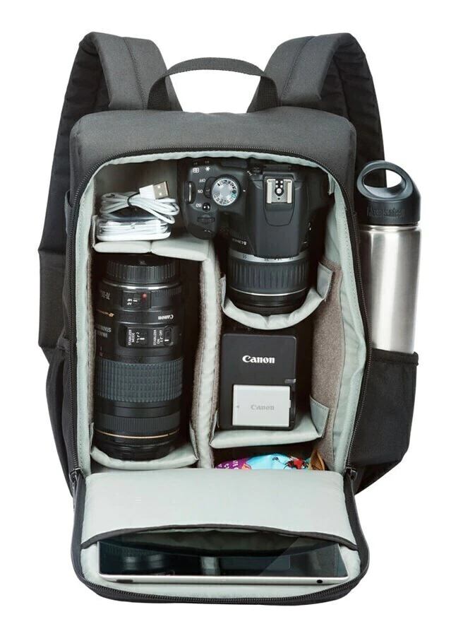 Transporte seus equipamentos compactos , tablet de até 10 polegadas e acessórios alguns acessórios com a mochila Lowepro Format 150 LP36625 que apresenta paredes super acolchoadas, divisores ajustáveis para manter seus pertences seguros . Os bolsos laterais torná fácil transporte de um mini tripé ou até mesmo garrafas d'água. Conta ainda com um pequeno bolso na tampa de abertura que é capaz de alojar cartões de memória, baterias, fones, etc.