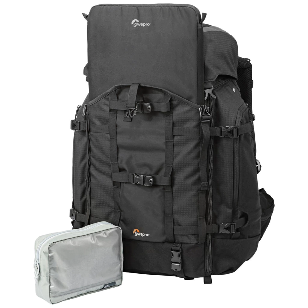 Transporte e proteja 1-2 DSLRs profissionais e uma lente 400 mm F/2.8 acoplada na cameraom a Pro Trekker 450 AW preta com compartimento para laptop da Lowepro.