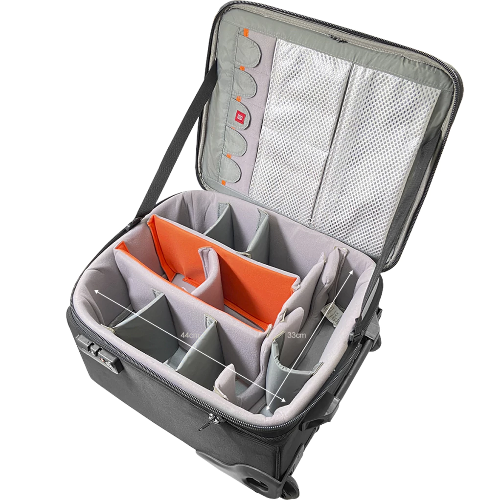 Seu interior é aconchegado protegendo os equipamentos que estão sendo carregados, conta com uma dimensão de 44cm X 33cm aproximadamente, as divisórias possuem lacres onde é possível ajustar a divisão de acordo em que desejar. Além disso acompanha outra mochila em seu interior com rodinhas e alça de mão de até 58cm de altura máxima e 30cm de altura mínima, em que é capaz de transportar objetos pessoais como; roupas, blusas, chapéus, e entre outros. Possui outro compartimento para transportar notebook de até 15,6 polegadas e acomodação para 01 tripé na lateral (preso por fivelas).