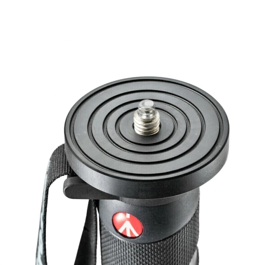 Um diferencial deste monopé em comparação a outros no mercado é que em sua base para fixar câmera ou cabeça de tripé/monopé, apresenta um único pino que conta com rosca 1/4' e adaptador 3/8' que conta com um sistema que quando for usar a rosca 1/4' o adaptador 3/8' pode ser facilmente abaixado para o corpo da base evitando sua perda, conforme mostra em uma das fotos acima.