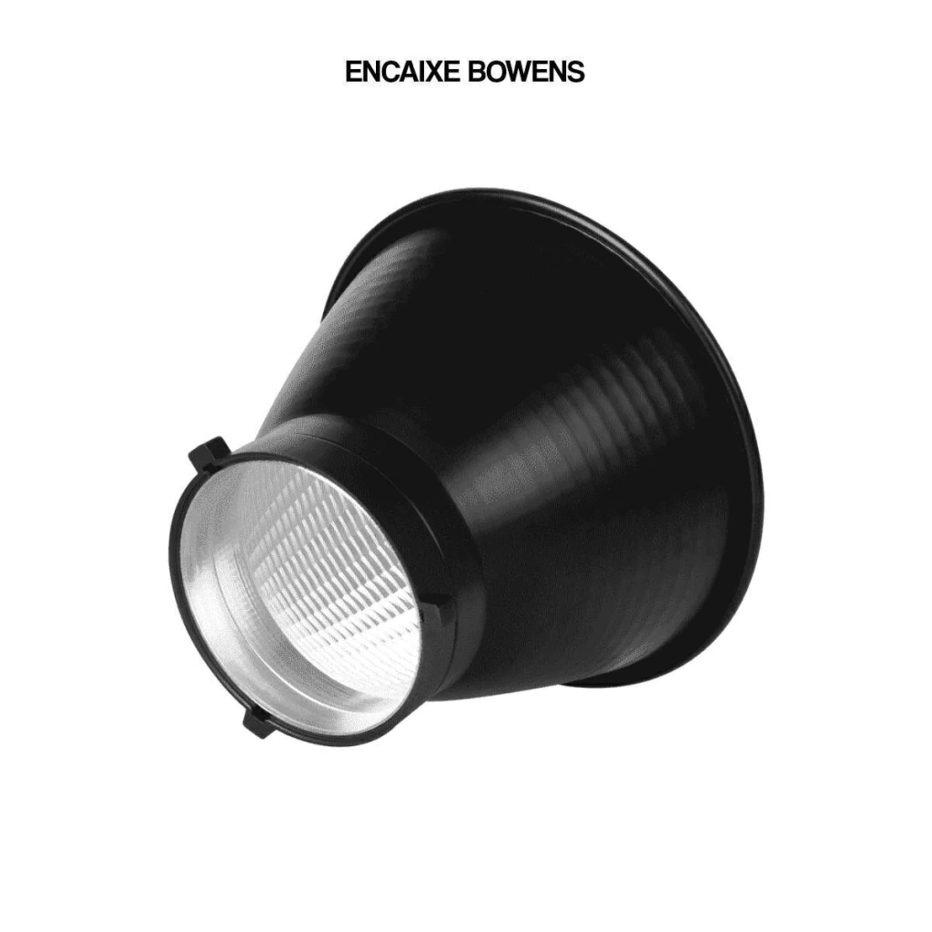 O Refletor conta com encaixe do tipo padrão bowens para ser usado em flashes, tochas de estúdios fotográficos.