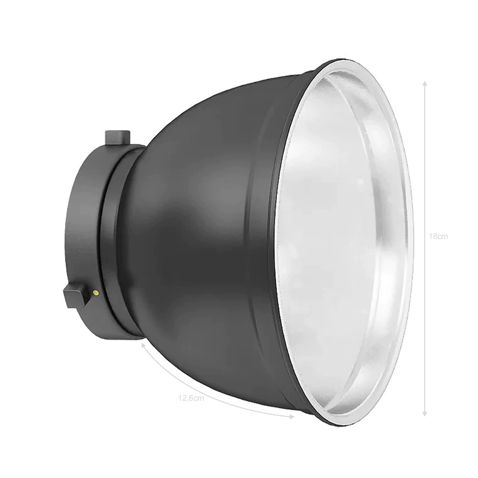 O refletor amplia ainda mais a iluminação do seu flash tocha, além de contar com dimensões de 180mm de comprimento no bocal por 126mm de profundidade e pesa somente 230 gramas.