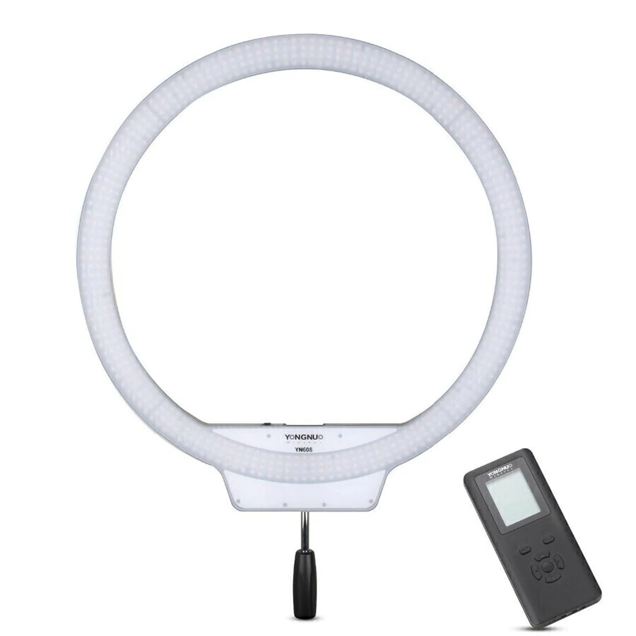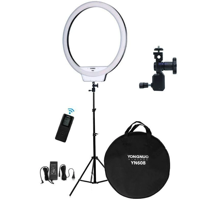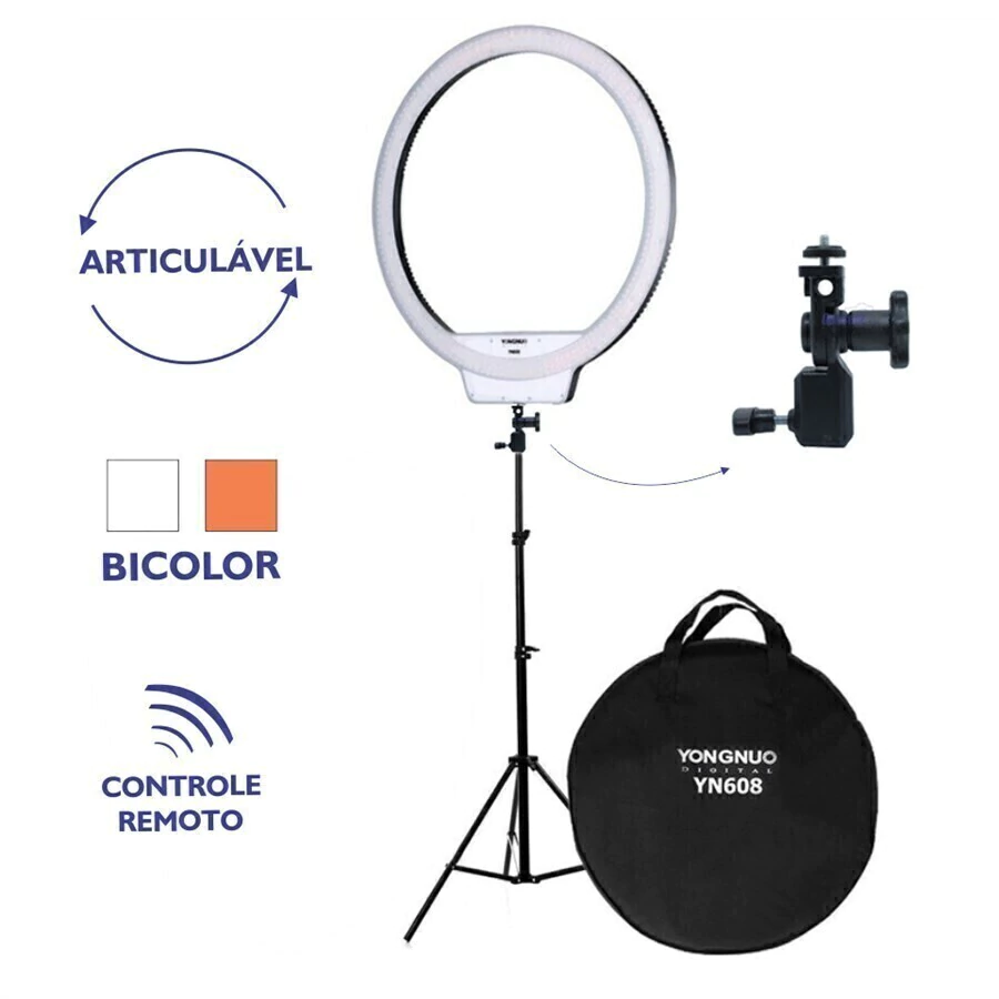 Kit Iluminador Circular Ring light profissional Yongnuo Yn 608 Bi color com tripé de 2 metros de altura e cabeça ball head para ajustar o ângulo do led, pertence a uma classe de iluminadores muito comuns na indústria da moda e beleza pois criar-se um olhar fascinante, brilhante, além de iluminar perfeitamente o rosto da modelo possibilitando fotos de maquiagens para estúdios de beleza.