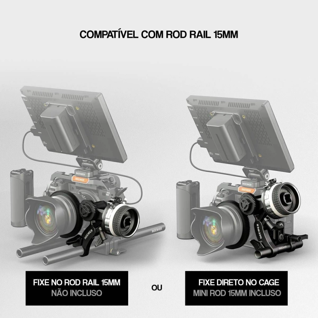 padrão ROD de 15 mm e uma braçadeira de haste. Eles podem fixar o follow focus