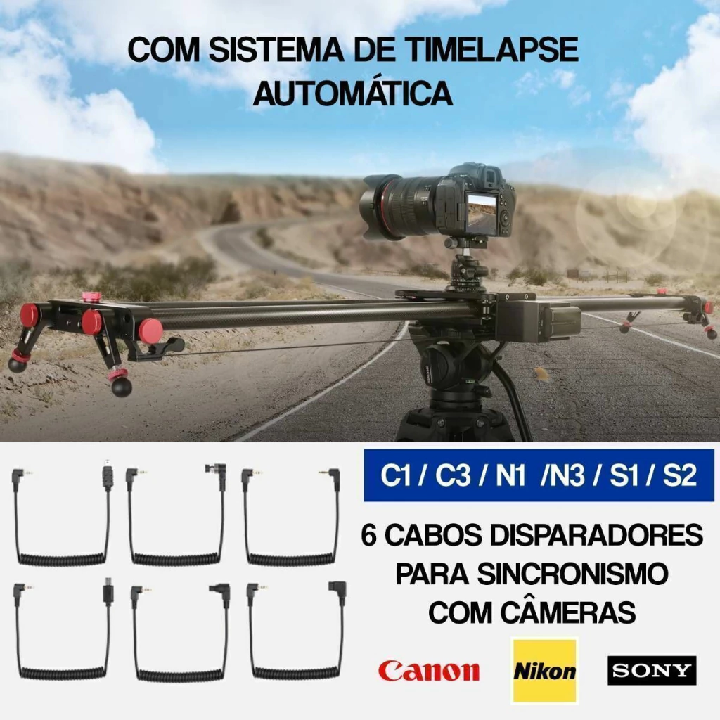 6x cabos de sincronismo para disparo do obturador estão inclusos, com ele você configura o slider diretamente no aplicativo e o slider passar a seguir suas configurações de intervalo de tempo de cada foto, gravações de vídeo que a câmera seguirá.