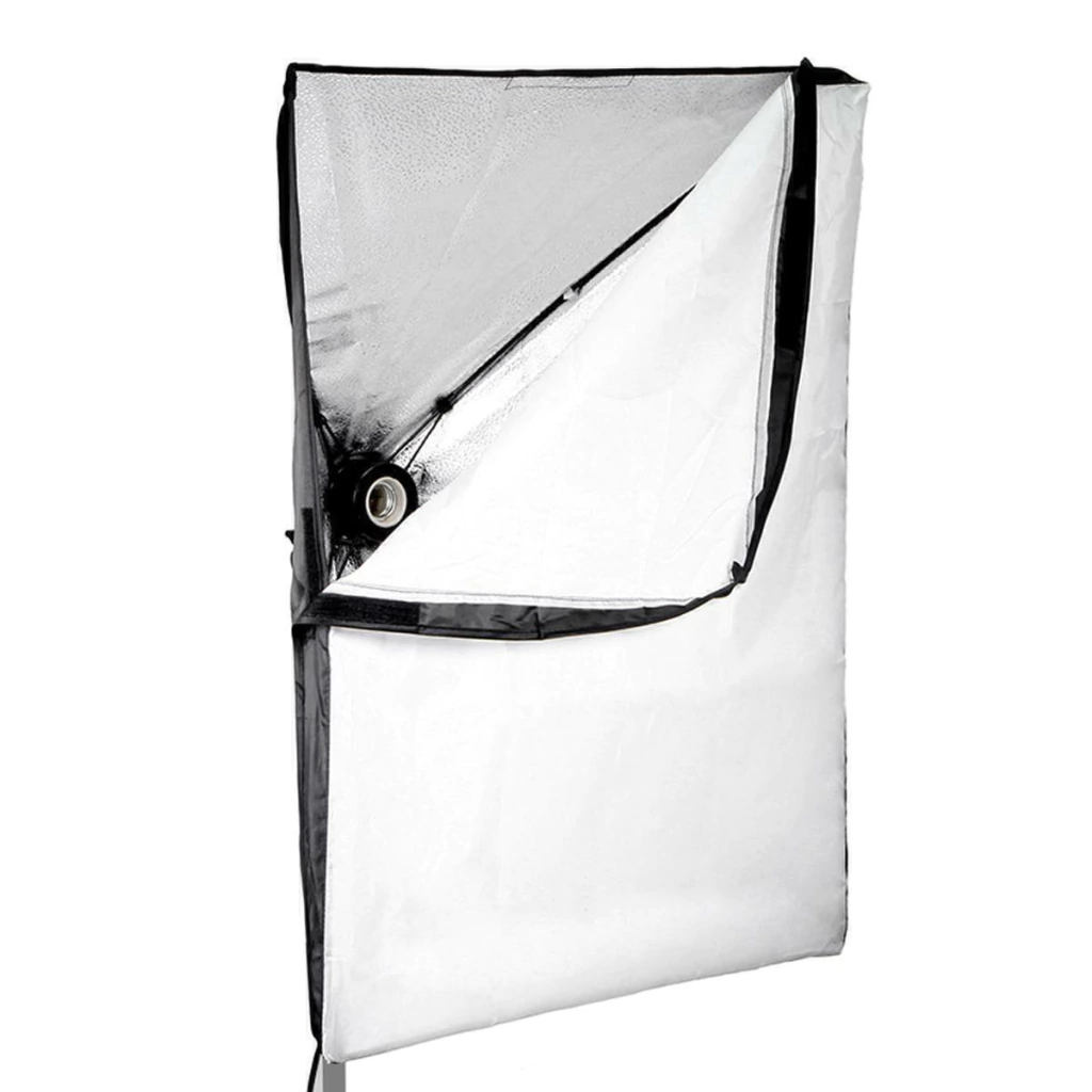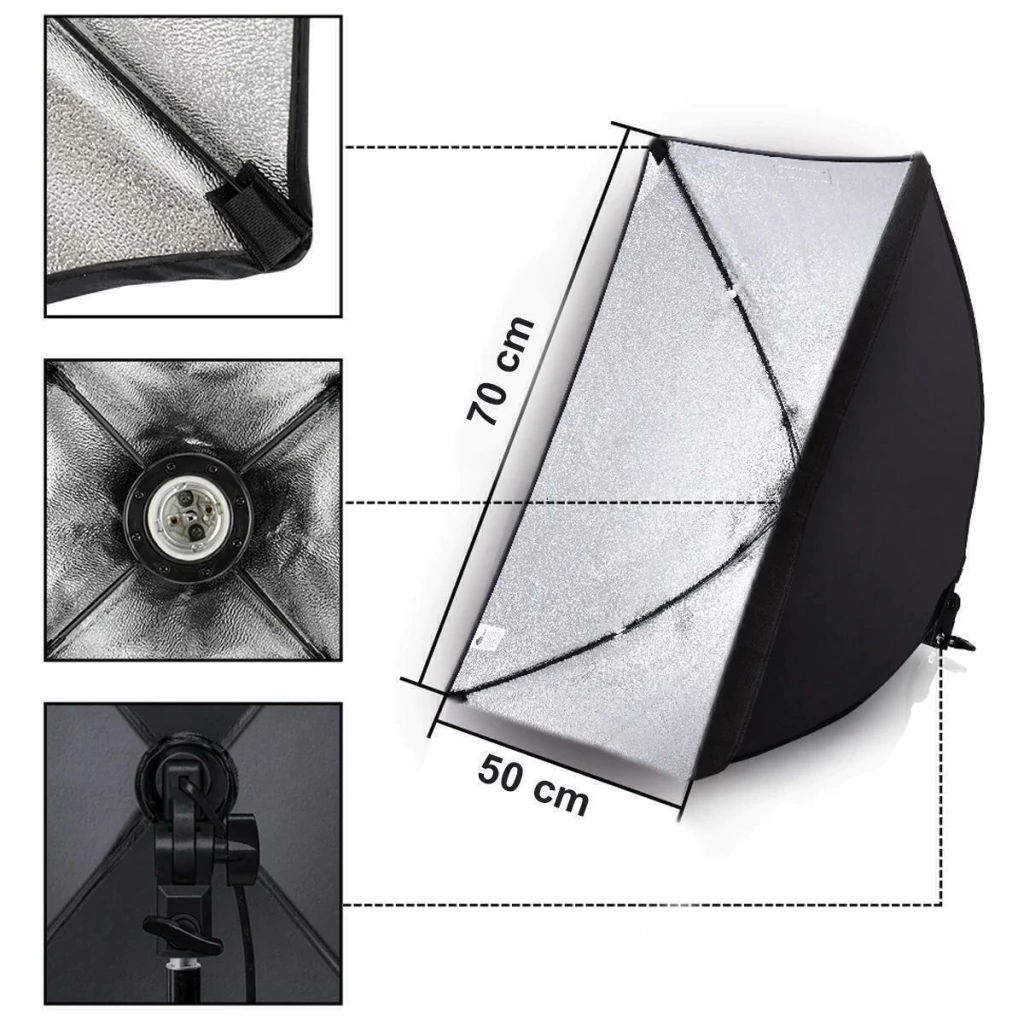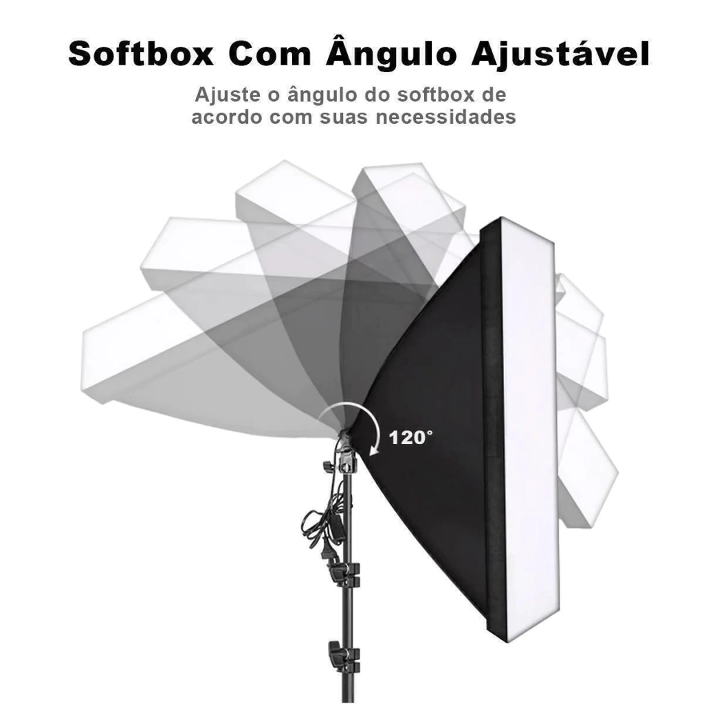 Este softbox é capaz de suportar lâmpadas de todas as potências e voltagens desde que seja soquete E27, além disso o soquete possui encaixe para tripés de iluminação e rotação 120° na vertical.