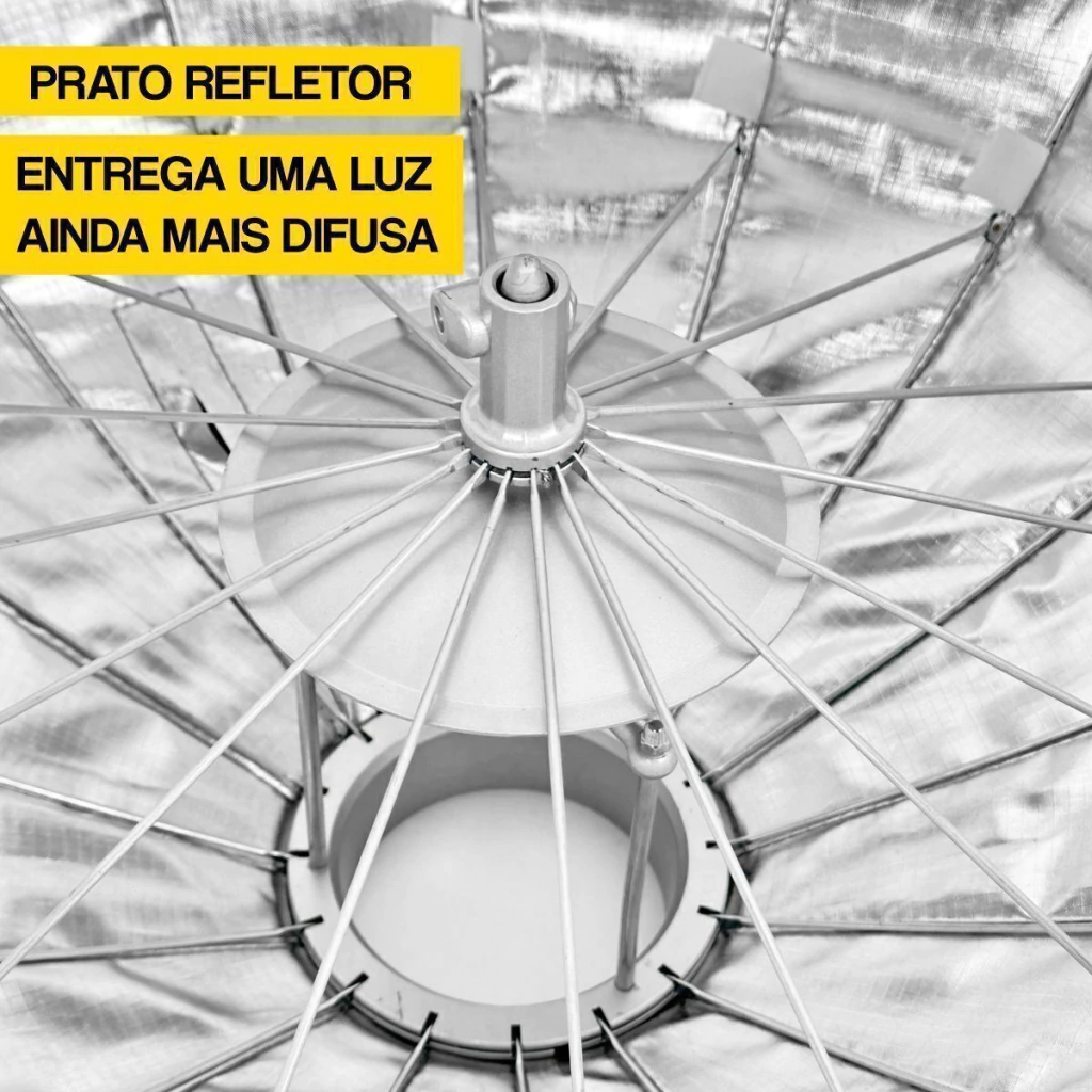 Diferencial está no prato refletor incluso dando efeito de um BEAUTY DISH, espalhando uniformemente a luz pelo soft, além de sua montagem rápida.