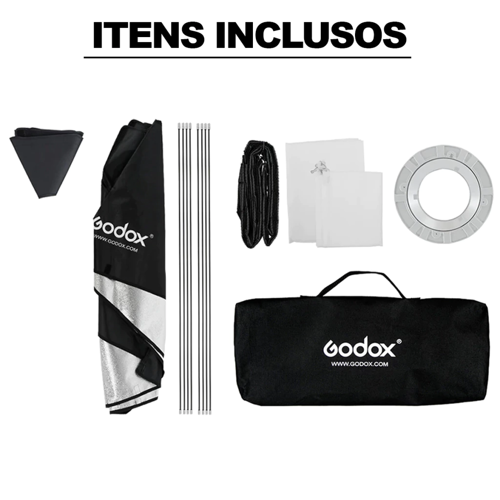 O Softbox 95cm Octagonal Godox é um modificador de luz que permite obter um padrão de luz suave no objeto que está sendo fotografado.