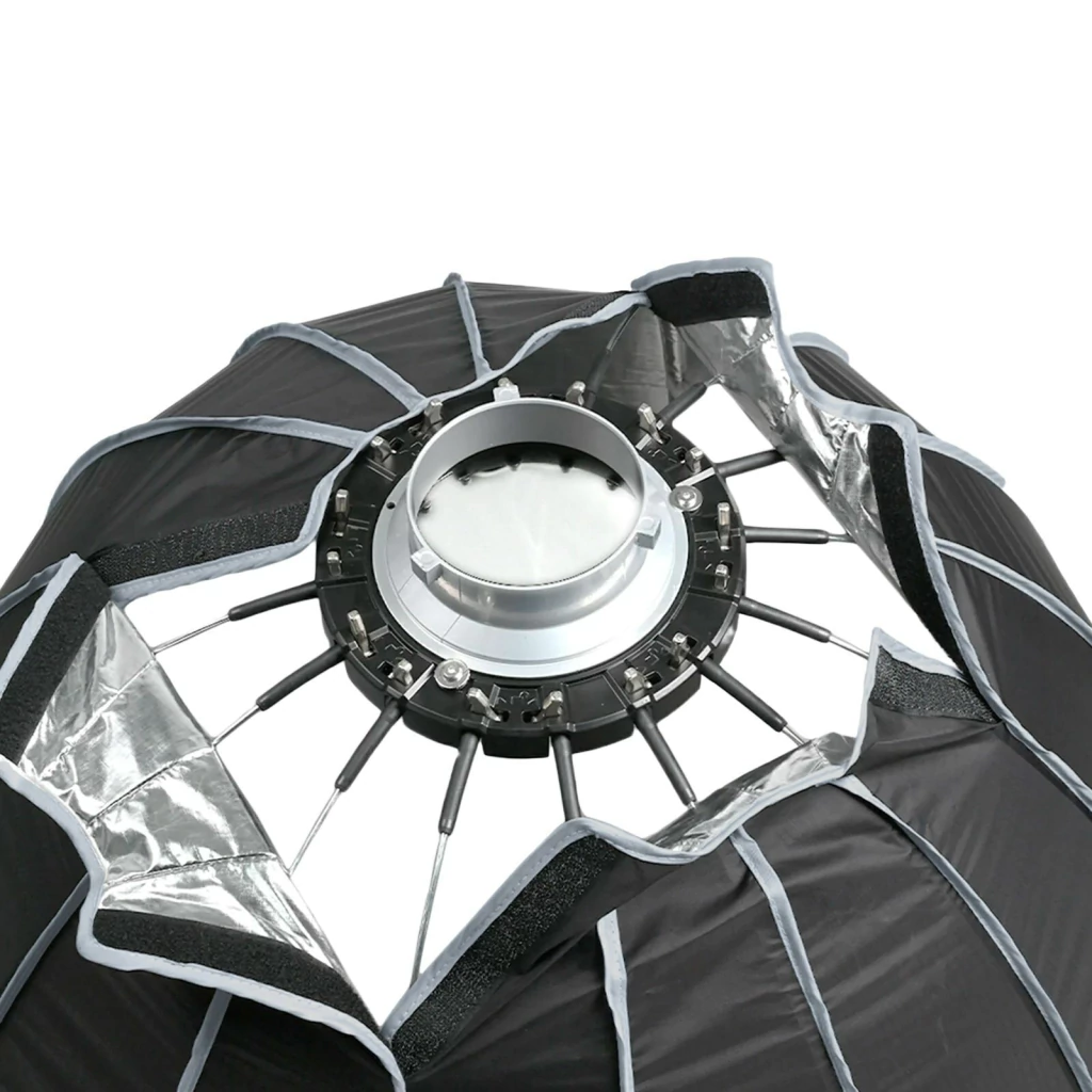 O interior prateado refletivo potencializa o aproveitamento da luz, enquanto os dois difusores (interno e frontal) suavizam as sombras e equilibram a exposição. Acompanha ainda uma tela em forma de colmeia (grid), que direciona a luz para o assunto principal e reduz vazamentos laterais, garantindo mais controle sobre o foco da iluminação.