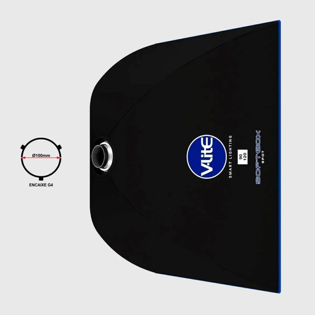 Softbox difusora retangular com encaixe bowens 90x120cm Mako V-lite Spot, possui uma tela difusora intermediária e outra externa enquanto seu material interno é prateado, oque permite refletir mais luz.