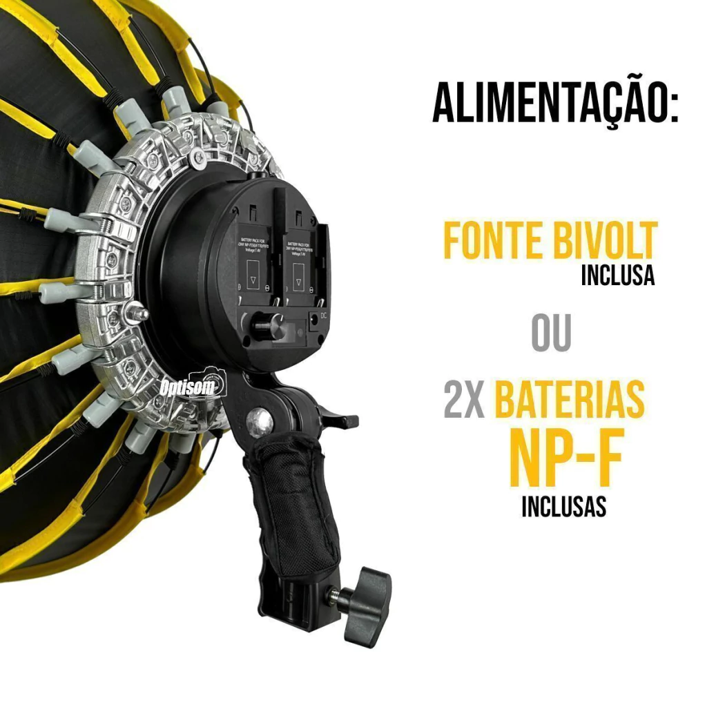 Versátil, com esse softbox você tem a possibilidade de usar na tomada (fonte inclusa) ou então em externas com o uso de duas baterias montagem NP-F (não inclusas).